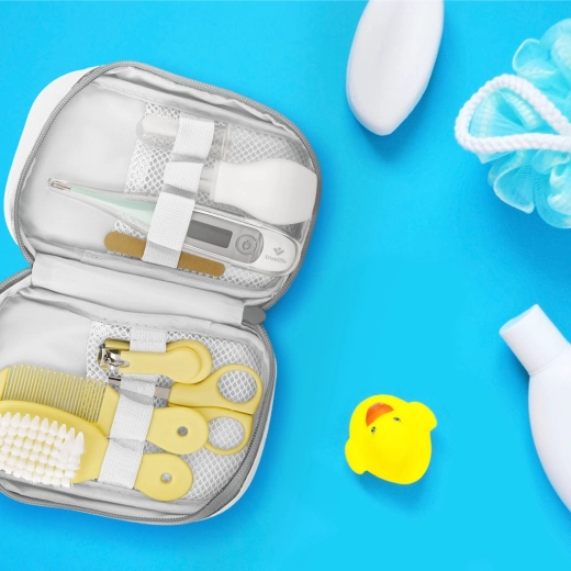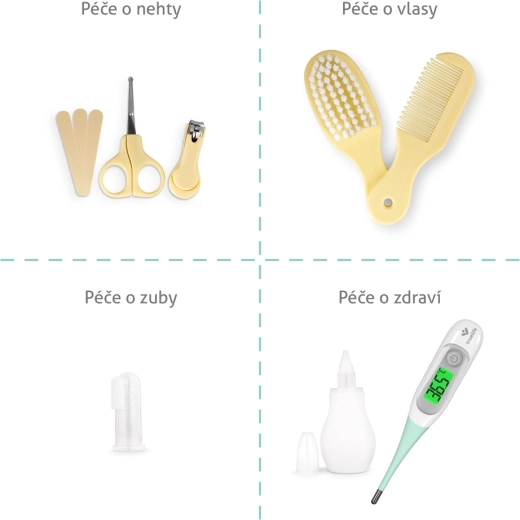 Lekerekített hegyű körömolló és körömcsipesz, reszelők, puha kefe, fésű, orrszívó és ujjas fogkefe – mindig kéznél és biztonságosan tárolva.