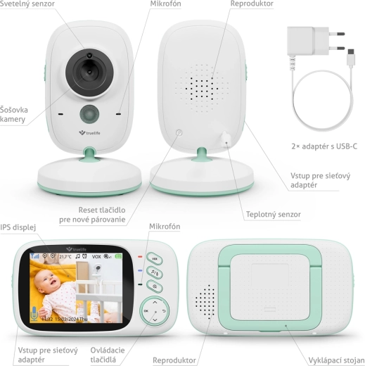- Kamera (gyermekegység), szülői egység, 2× USB-C adapter, használati útmutató