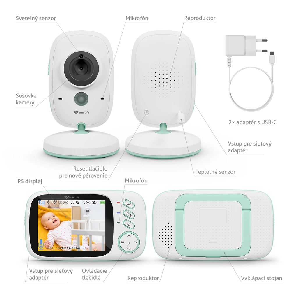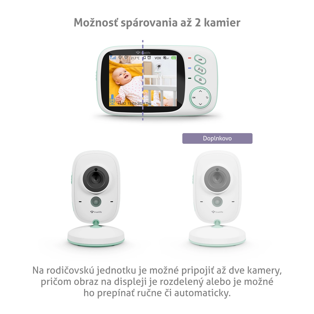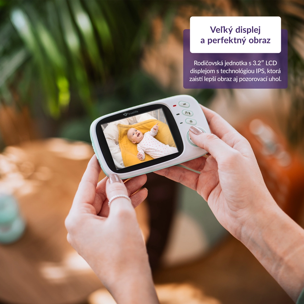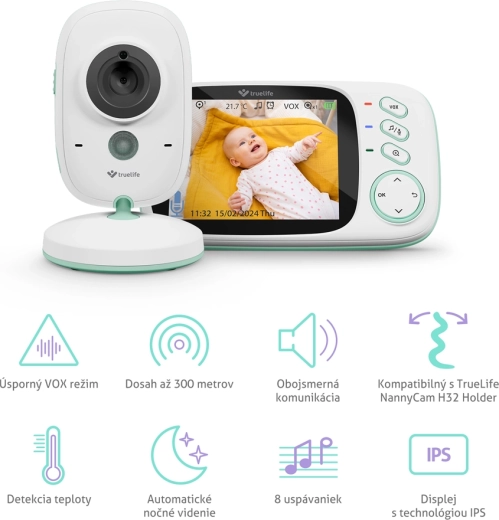 A praktikus VOX üzemmód akár 20 órára növeli az üzemidőt azáltal, hogy a képernyő csak hang észlelésekor ébred fel. A bébiőr méri a helyiség hőmérsékletét, és értesít a változásokról. A legfeljebb 300 m-es hatótávval nyílt terepen otthon szabadon mozoghat. Nagyobb lefedettséghez akár 2 kamera is párosítható, a kamerát igény szerint meg lehet dönteni; a kiságyhoz külön megvásárolható a TrueLife NannyCam H32 Holder tartó.