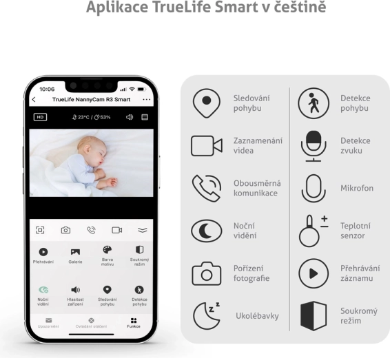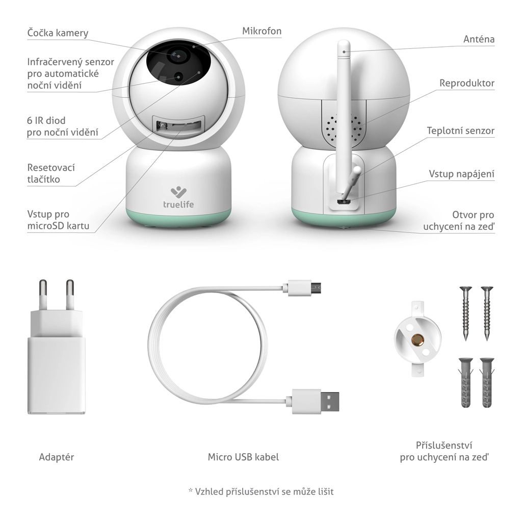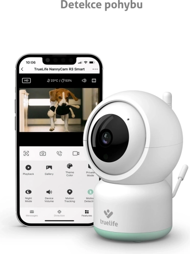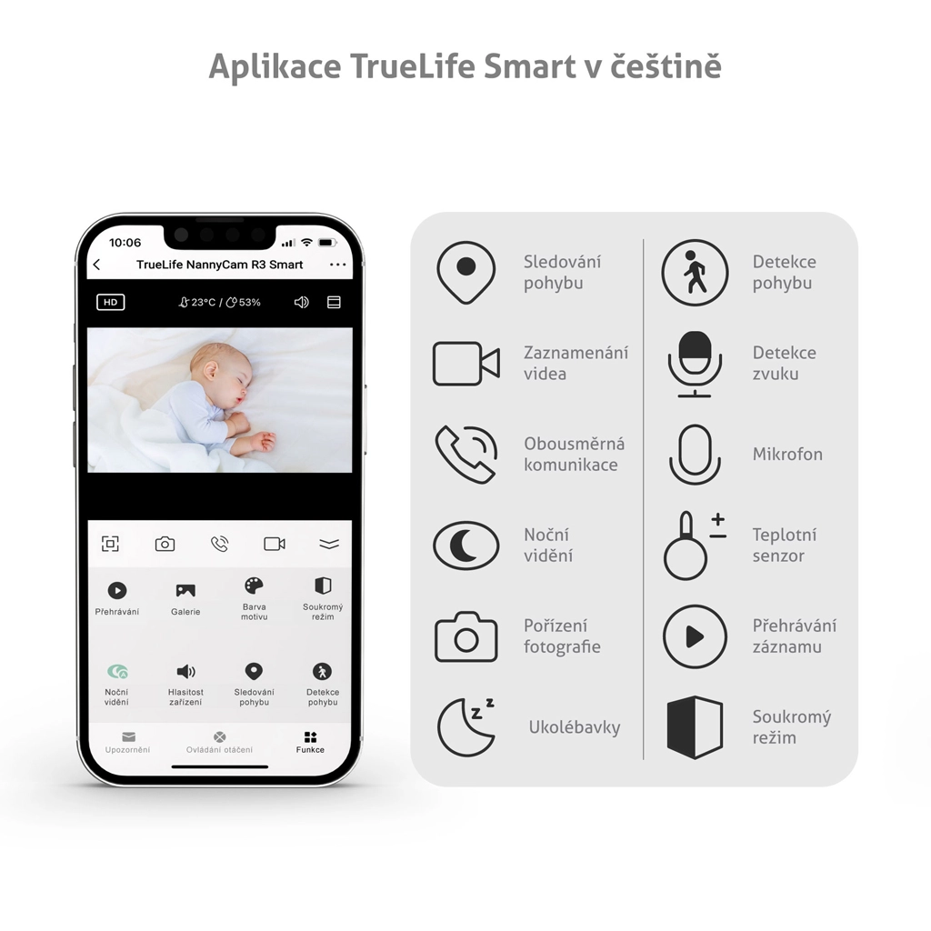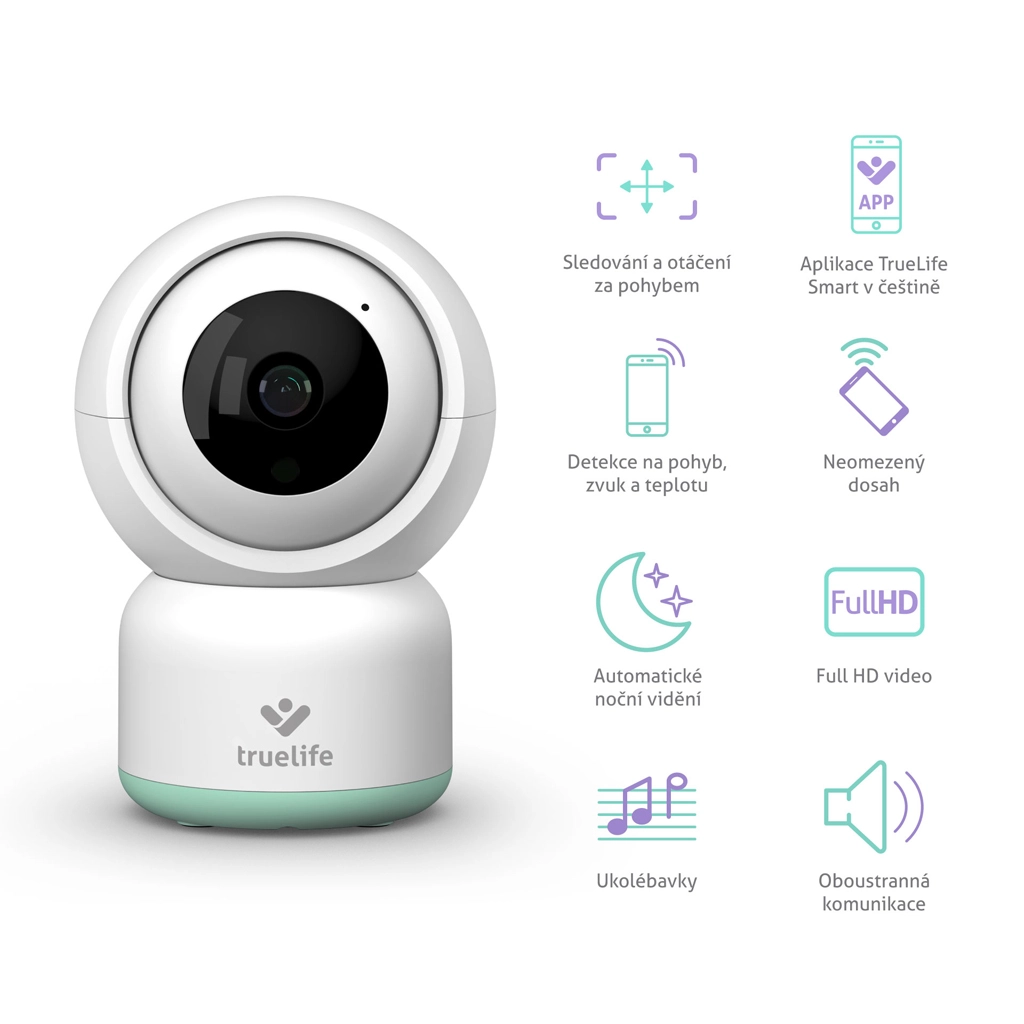 A TrueLife NannyCam R3 Smart modern videós bébiőr a nyugodt alvásért – a babáéért és az önéért is. A 100°‑os nagylátószögű objektívvel és 1080p Full HD felbontással szerelt forgatható kamera nappal és éjjel is tiszta képet ad az automatikus éjjellátásnak köszönhetően. Az interneten át korlátlan hatótávot kap, a teljesen magyar nyelvű TrueLife Smart alkalmazásban pedig mindent láthat, hallhat és beállíthat – beleértve a mozgásra, hangra és hőmérsékletre vonatkozó értesítéseket is.