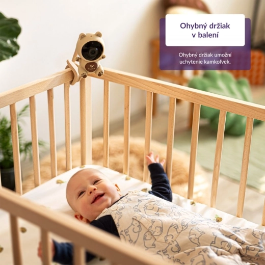 A diszkrét szilikon mackó természetesen illeszkedik a gyerekszobába. A hajlítható tartó megkönnyíti a rögzítést kiságyra vagy polcra – oda, ahol éppen szükség van rá.