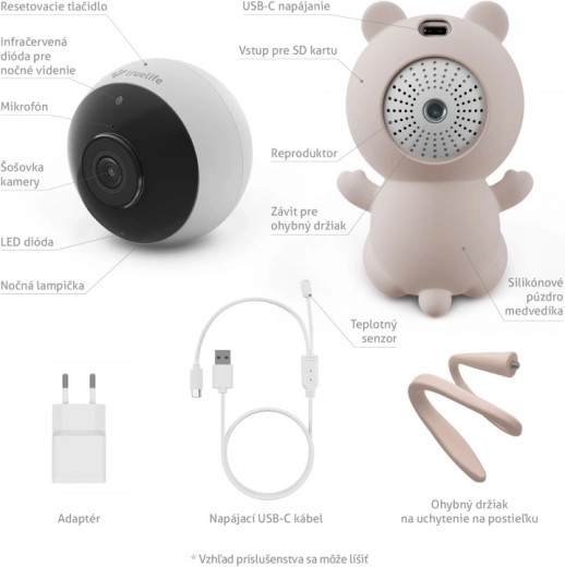 - NannyCam S3 intelligens kamera, szilikon mackó tok, USB‑C kábel hőmérséklet-érzékelővel, hálózati adapter, rugalmas tartó a kiságyhoz, használati útmutató és biztonsági tájékoztató, reset tű