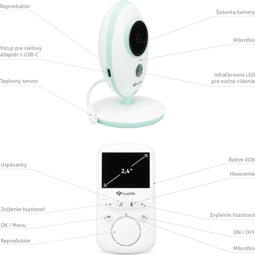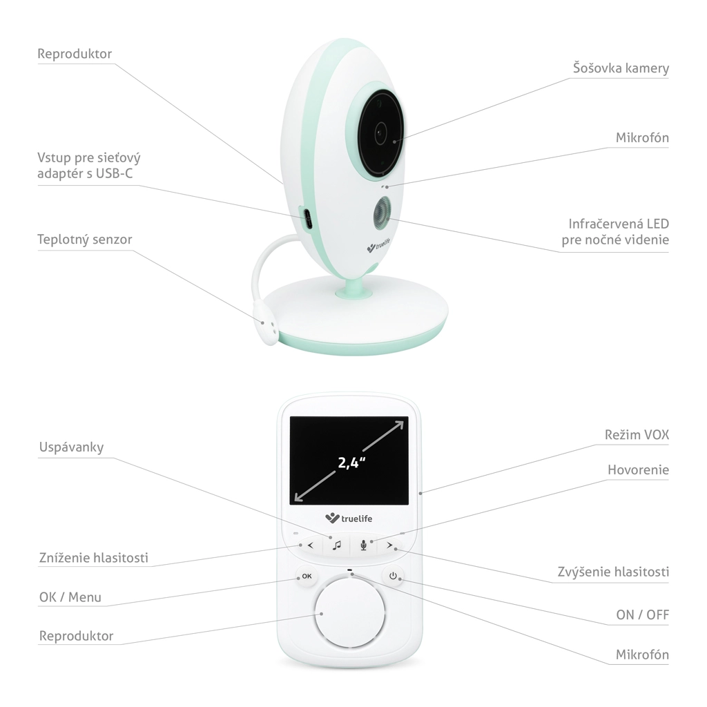 A TRUELIFE NannyCam V24 Pro digitális bébiőr tiszta képet nappal és éjjel, áttekinthető 2,4" színes LCD‑t, stabil 2,4 GHz‑es kapcsolatot akár 300 m hatótávval és kétirányú hangkommunikációt kínál. A VOX üzemmódnak köszönhetően a szülői egység akkumulátora akár 24 órát is bír. Nem hiányzik az éjjellátás, a szobahőmérséklet‑mérés, az altatódalok és a modern USB‑C töltés powerbank‑támogatással.