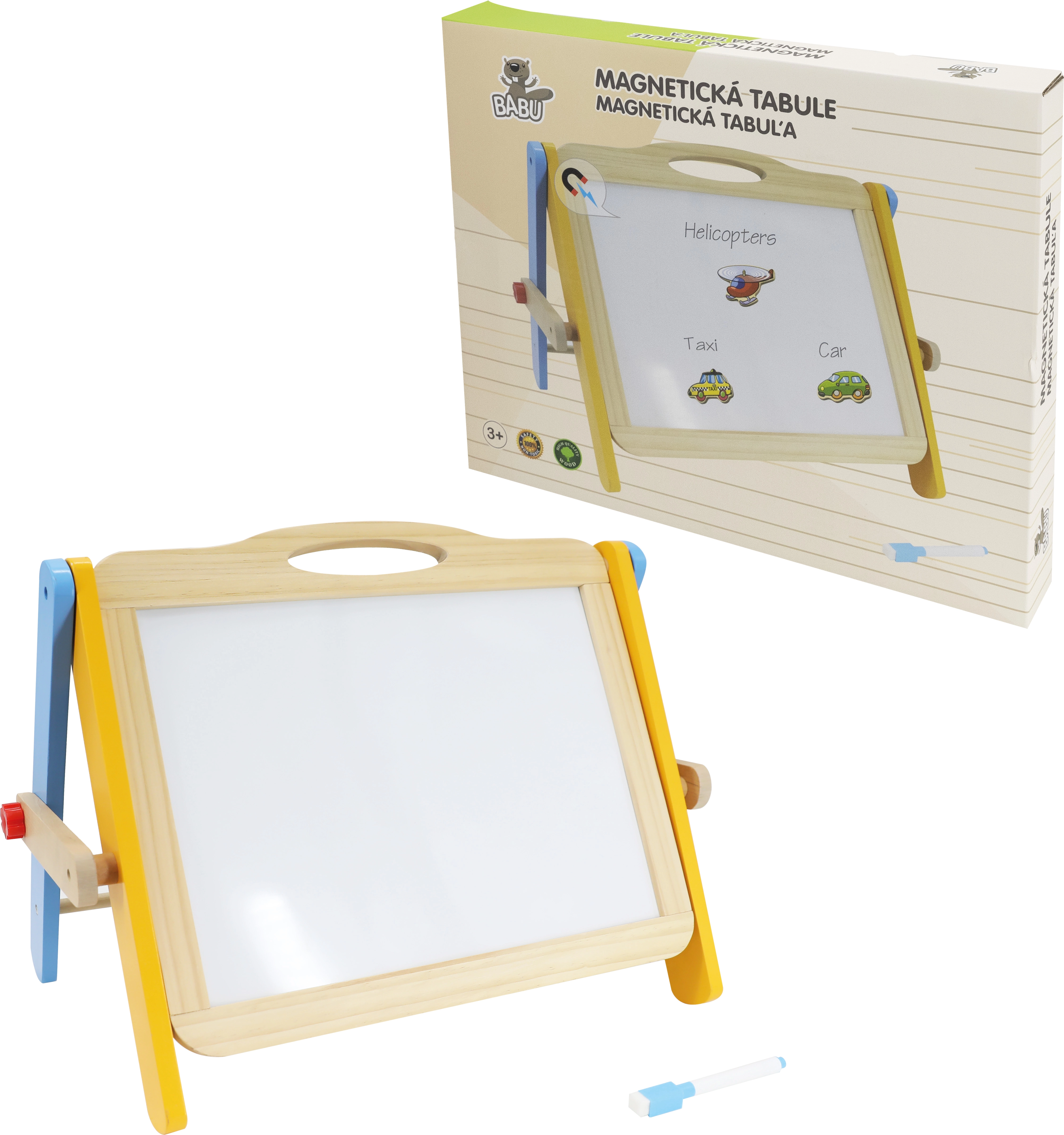 Támogasd a gyerekek kreativitását és tanulását a BABU kétoldalas fa táblával. Az egyik oldal krétával írható, a másik mágneses – ideális a fantázia, a finommotorika és a betűkkel való játék fejlesztéséhez. A csomag tartalmaz egy krétakészletet és mágneses betűket az azonnali szórakozáshoz. Kétoldalas használat, mágneses felület, minőségi fa kivitel és szórakoztató tanulás 3 éves kortól.