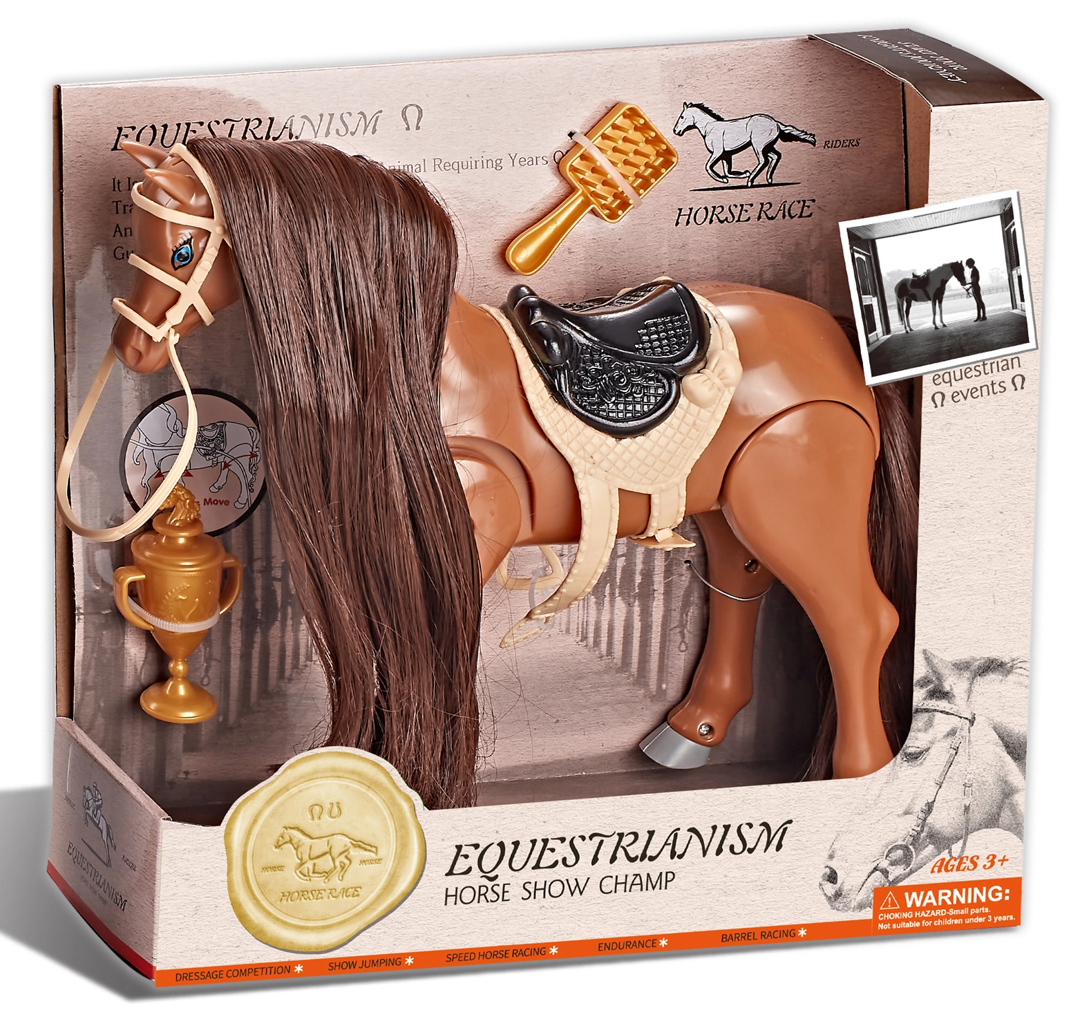 Ez a barna lovagló ló hangmodullal élethű játékélményt nyújt a gyerekeknek. Mozgás közben valósághű hanghatásokat indít, amelyek életre keltik a játékot, és bevonják a kis lovasokat a versenyek és akadályok világába. A ló teste minőségi és biztonságos műanyagból készült, amely intenzív használat mellett is tartós.