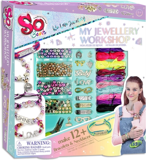 Ezzel a sokoldalú Tasia ékszerkészítő szettel a gyerekek könnyedén változtatják ötleteiket egyedi kiegészítőkké. A számos színben, formában és méretben elérhető gyöngyök lehetővé teszik az egyedi kombinációkat. A praktikus fogó megkönnyíti az alkatrészekkel végzett munkát és pontos rögzítést biztosít.