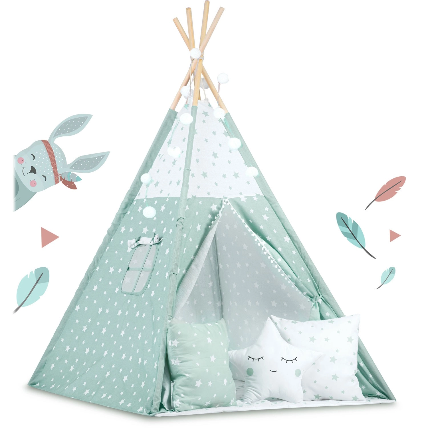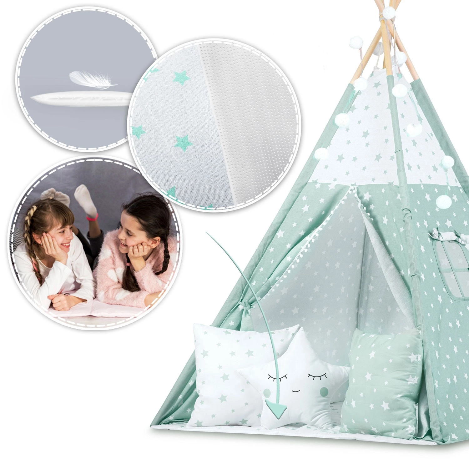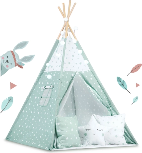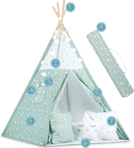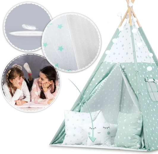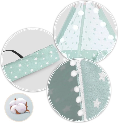 Stílusos gyerek tipi finom mentazöld színben, fehér csillagokkal – varázslatos játszó- és pihenősarkot varázsol bármely szobából. A borítás 100% prémium pamutból készült, amely légáteresztő, puha és egyben tartós. A stabilizátornak és a masszív lucfenyő rudaknak köszönhetően a szerkezet stabil és biztonságos. A nyitható ablak rolóval és a megkötős bejárat fejleszti a képzelőerőt, több fényt és friss levegőt enged be.