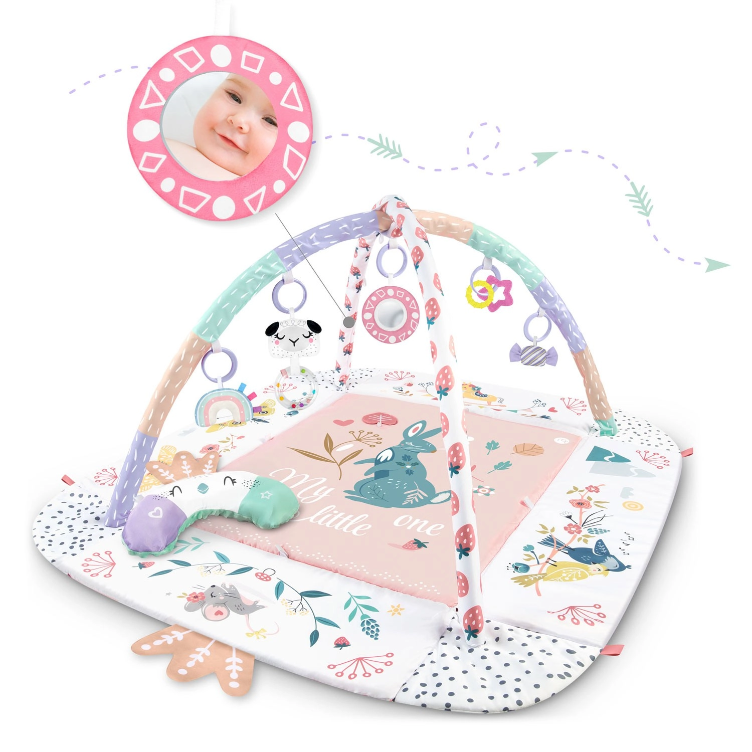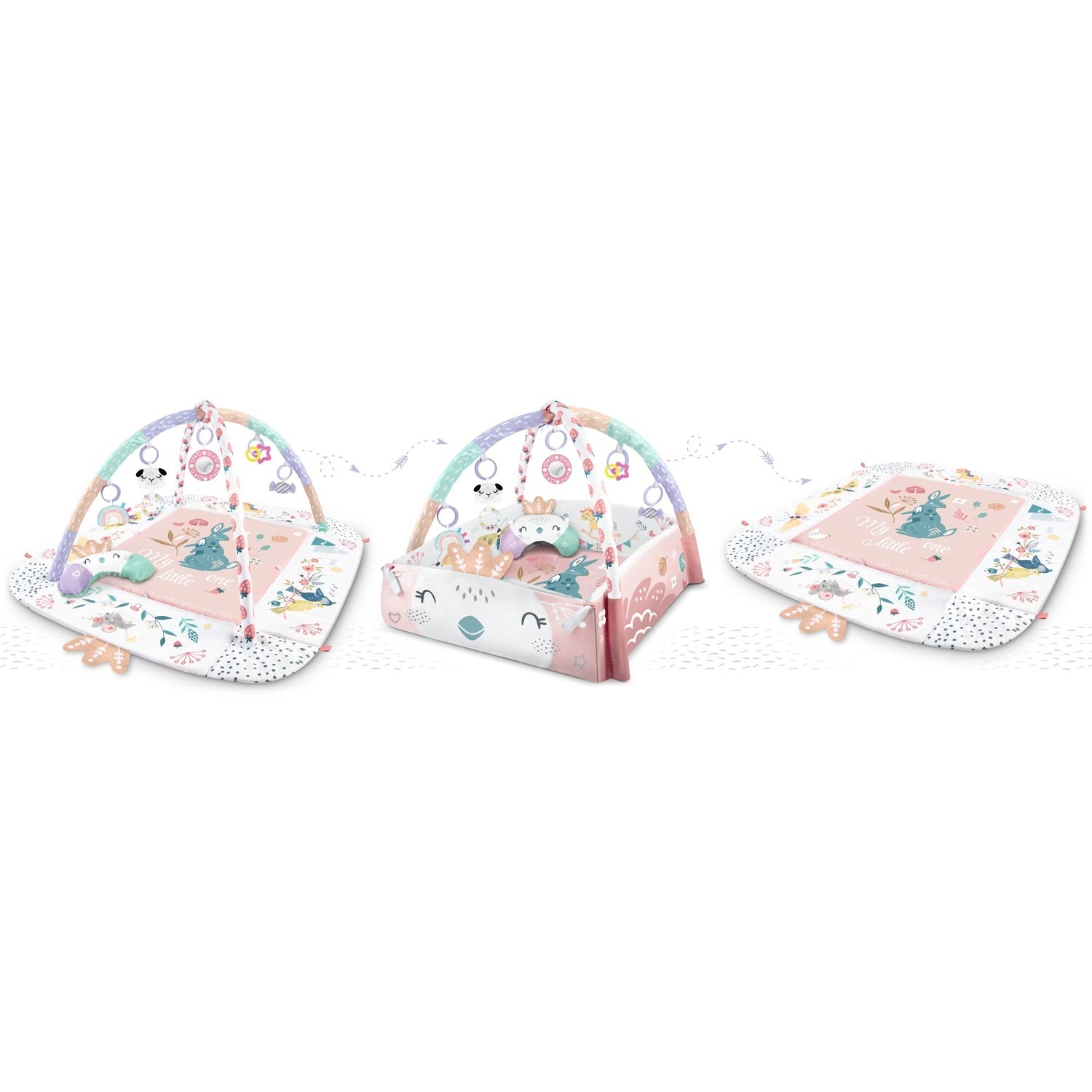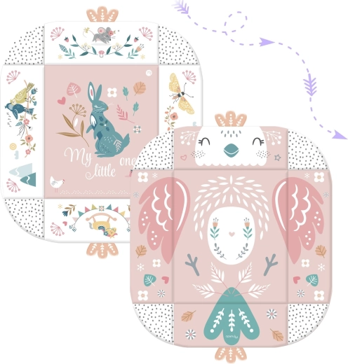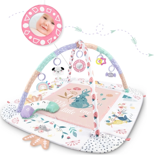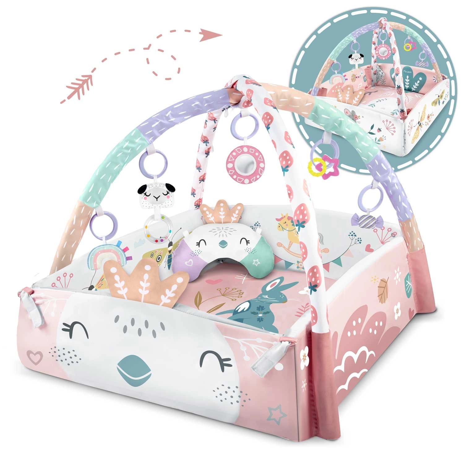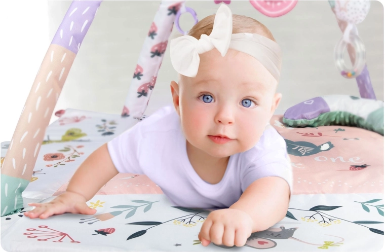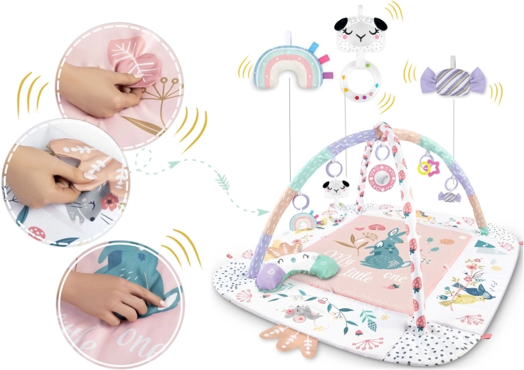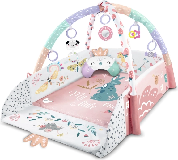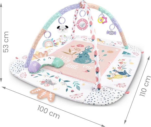 Az anyag puha, tartós és könnyen tisztítható, az alsó oldal pedig kiválóan szigetel a hidegtől. A pasztell, kétoldalas állatmintás grafika kellemes környezetet teremt a mindennapi játékhoz és pihenéshez. A levehető és magasságban állítható íveknek, valamint az okos, tépőzáras pántoknak köszönhetően a játékok könnyen áthelyezhetők és a gyermek fejlődési szakaszához igazíthatók.