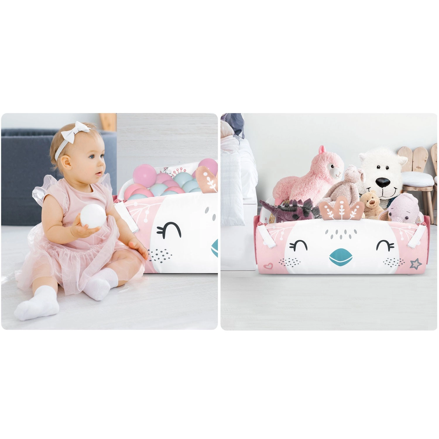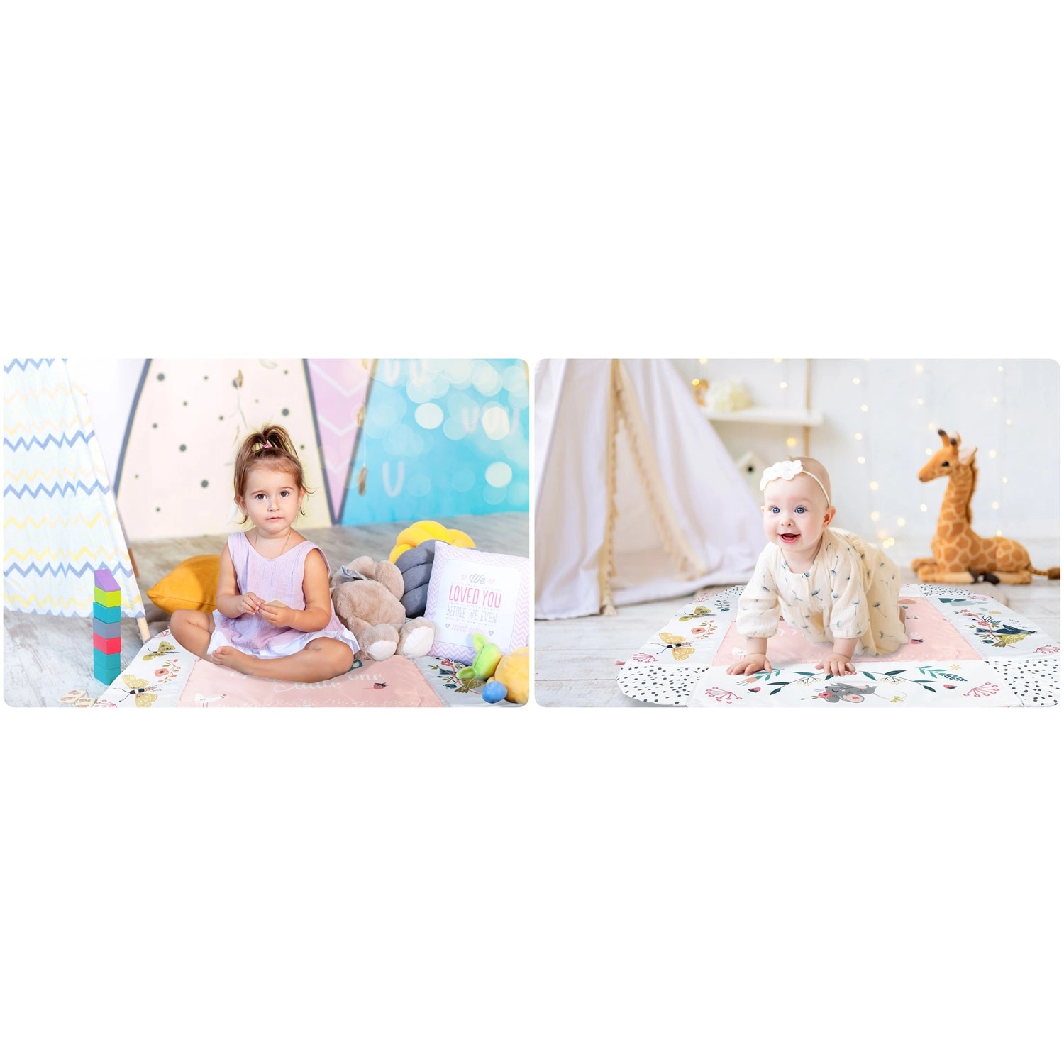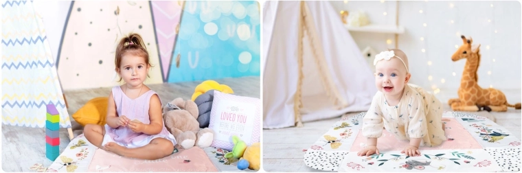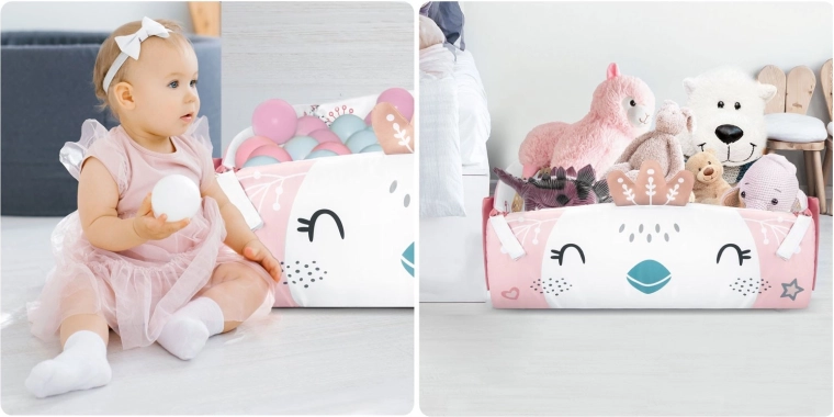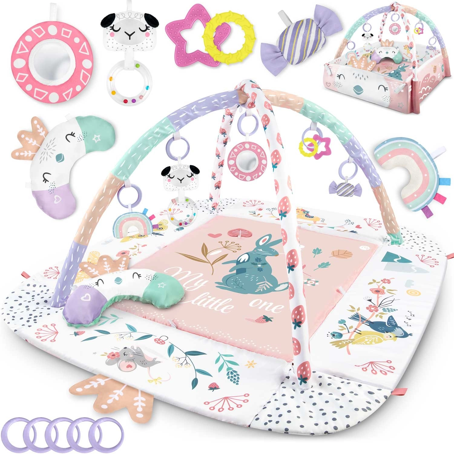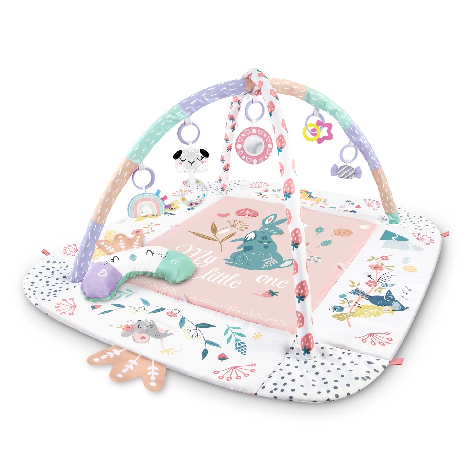 Az anyag puha, tartós és könnyen tisztítható, az alsó oldal pedig kiválóan szigetel a hidegtől. A pasztell, kétoldalas állatmintás grafika kellemes környezetet teremt a mindennapi játékhoz és pihenéshez. A levehető és magasságban állítható íveknek, valamint az okos, tépőzáras pántoknak köszönhetően a játékok könnyen áthelyezhetők és a gyermek fejlődési szakaszához igazíthatók.