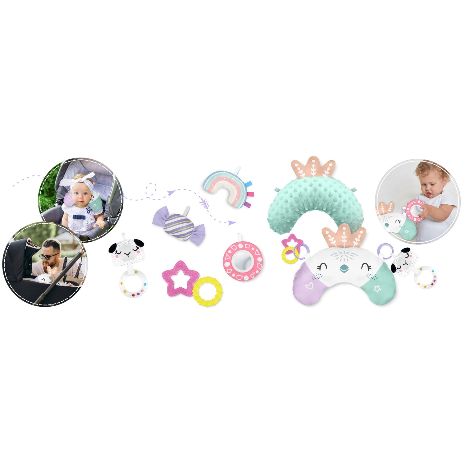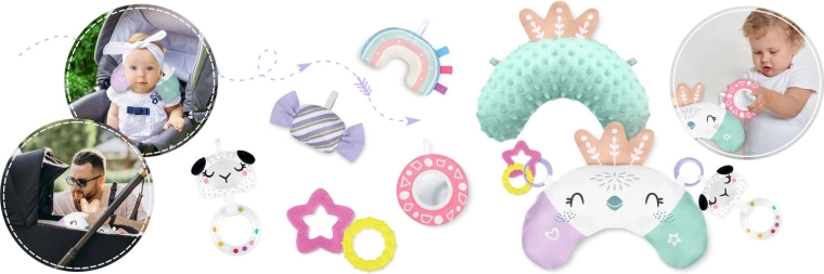 Törhetetlen, biztonságos anyagból készült tükör, csörgők, susogók, sípoló bárányka és rágókák fejlesztik a látást, hallást, tapintást és a fogást.