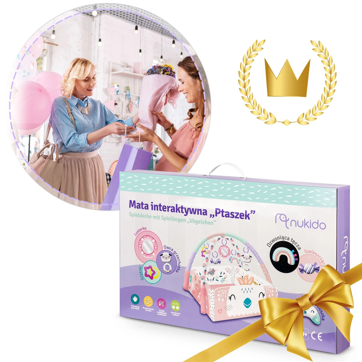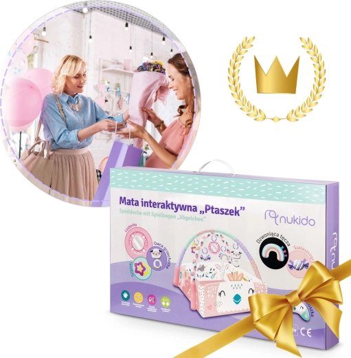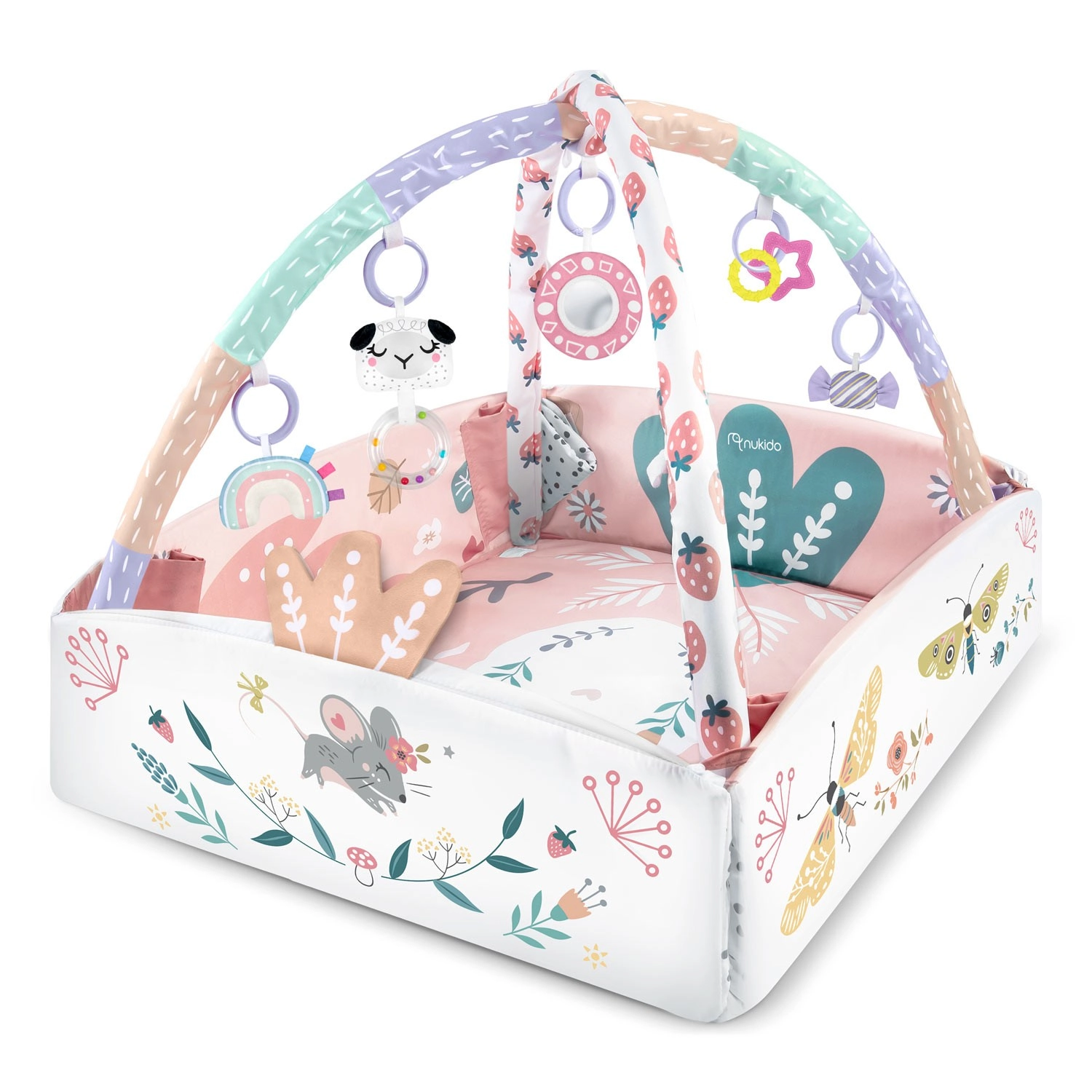 Fedezze fel a sokoldalú NUKIDO játszószőnyeget, amely együtt nő gyermekével. A szőnyeg 3 konfigurációban használható – nyitott alátétként, felhajtható oldalfalakkal a biztonságosabb játszókuckóért, valamint meghitt térként az első ücsörgéshez és játékhoz. 7 függeszthető játék (törhetetlen anyagú tükör, csörgők, susogó és sípoló elemek, rágókák) serkenti a látást, hallást és tapintást, valamint támogatja a finommotorikát.