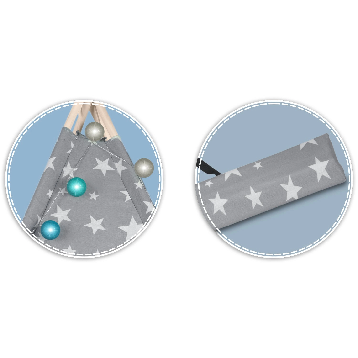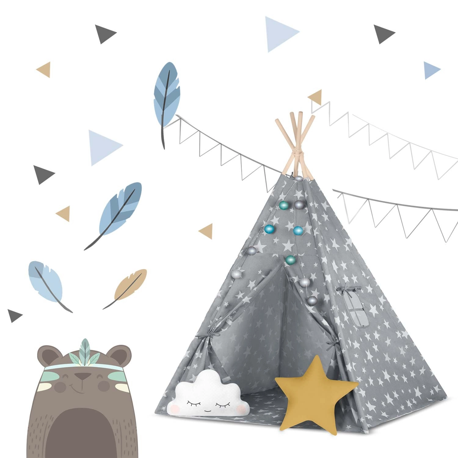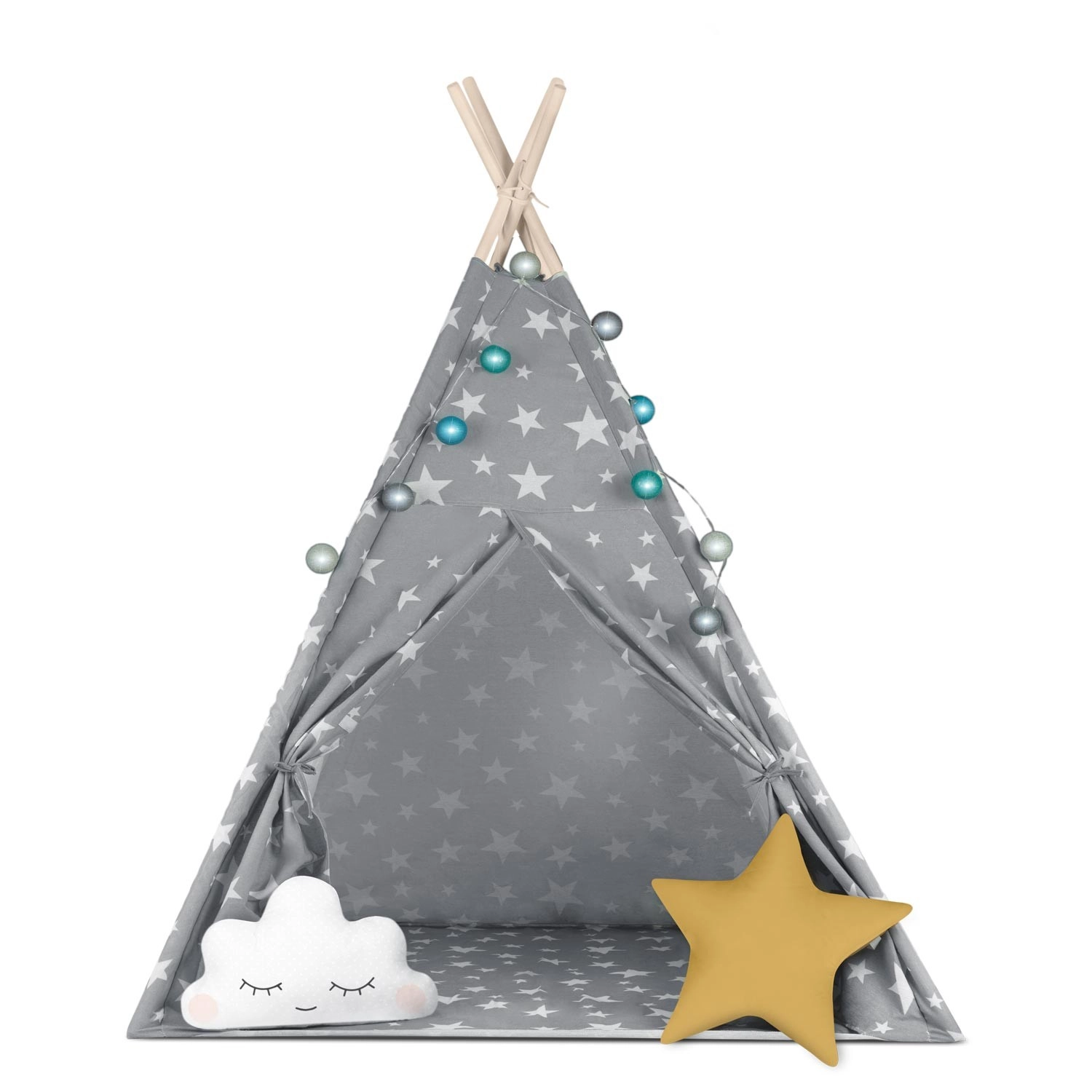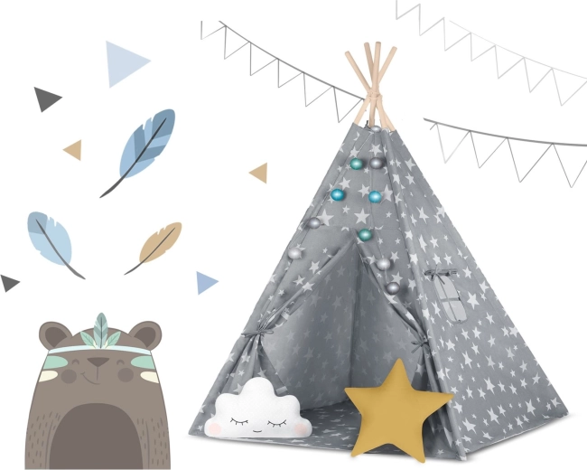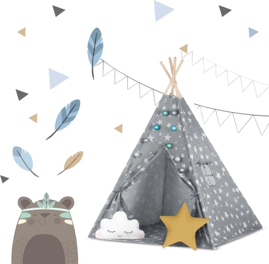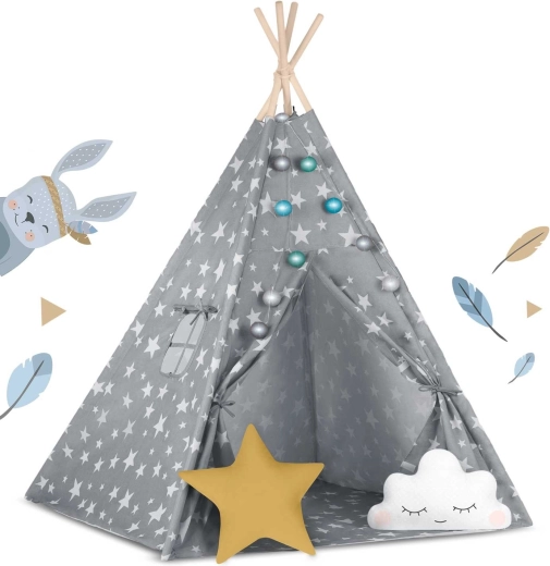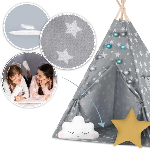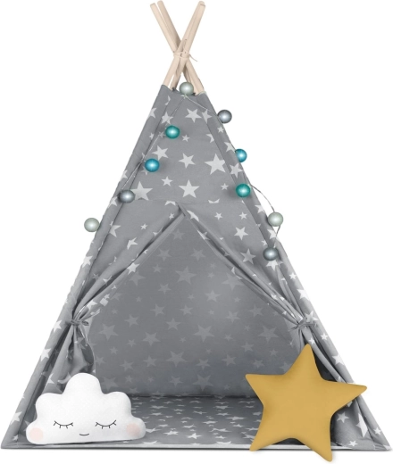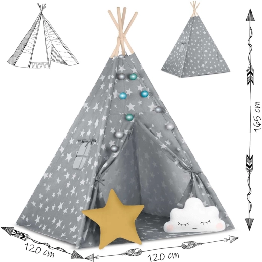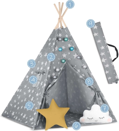 A csomag mindent tartalmaz, amire szükség van: 4 fenyőfa rúd, stabilizátor az extra szilárdságért, LED fényfüzér (elemmel működik), bevarrt alj, 2 puha párna felhő és csillag formában, ablak rolóval és praktikus hordtáska. A teepee könnyen összeszerelhető és hordozható – tökéletes a gyerekszobába, játszósarokba vagy a kert árnyékos részére.
