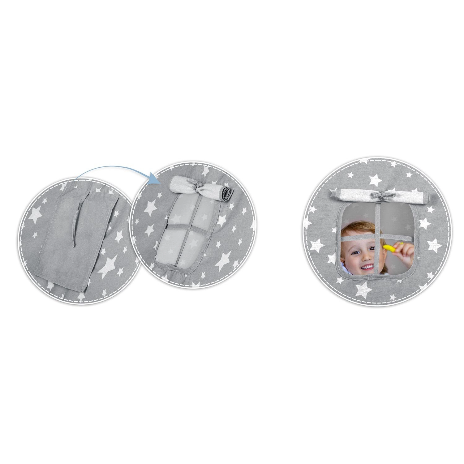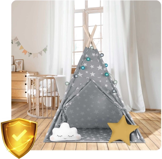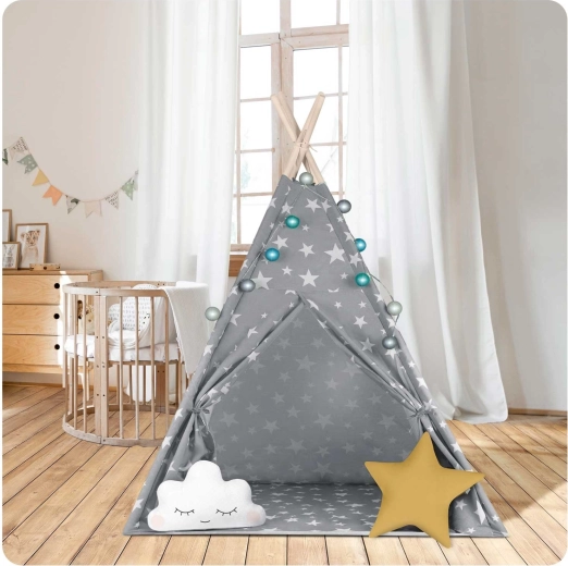 A NUKIDO gyerek teepee elegáns, csillagmintás szürkében a Montessori szellemében készült – támogatja az önállóságot, a fantáziát és a nyugodt olvasós perceket. A természetes anyagok és a minőségi kivitel biztonságot és kényelmet nyújtanak, míg a könnyű, légáteresztő prémium pamut egész nap kellemes környezetet biztosít.