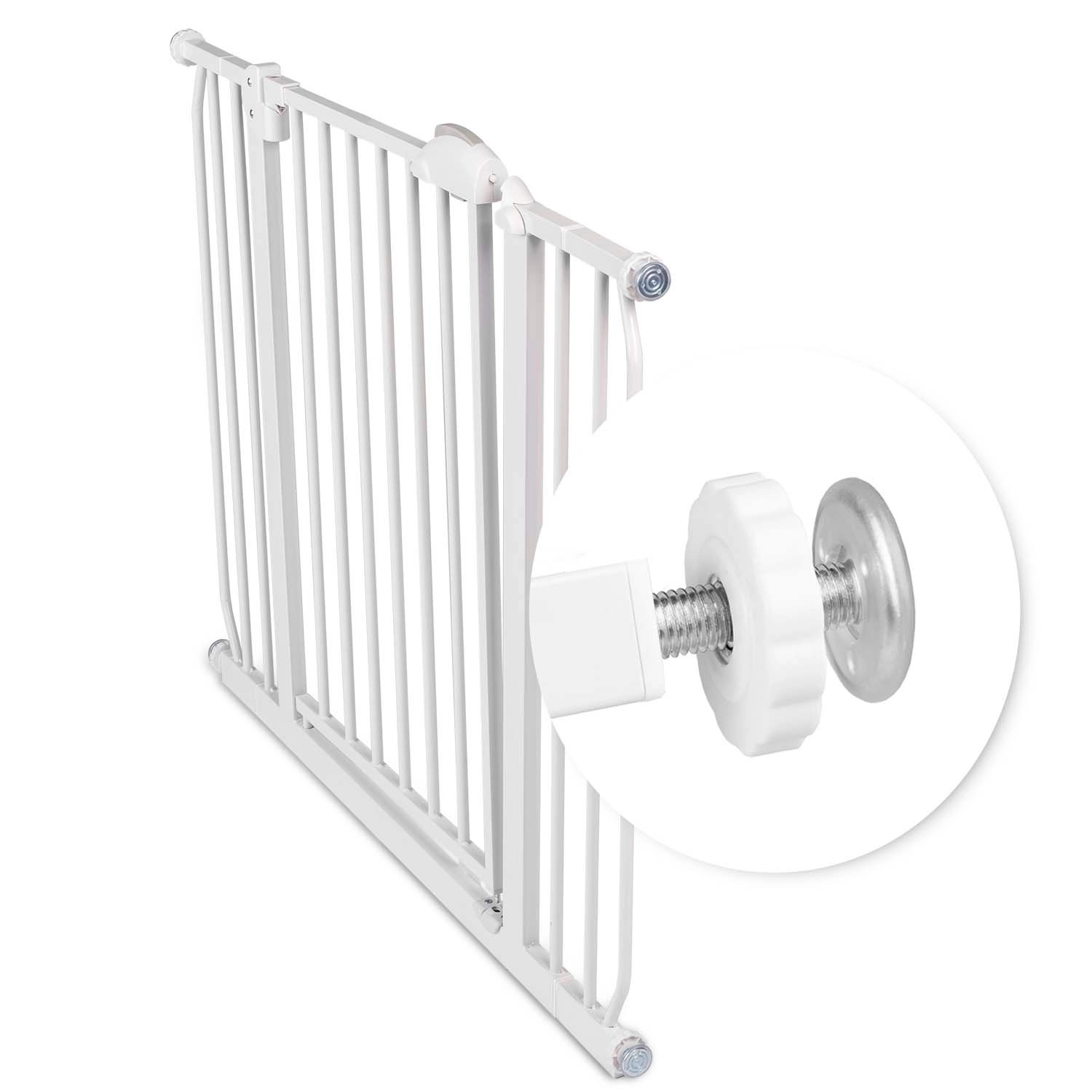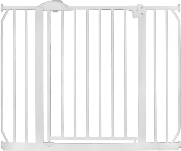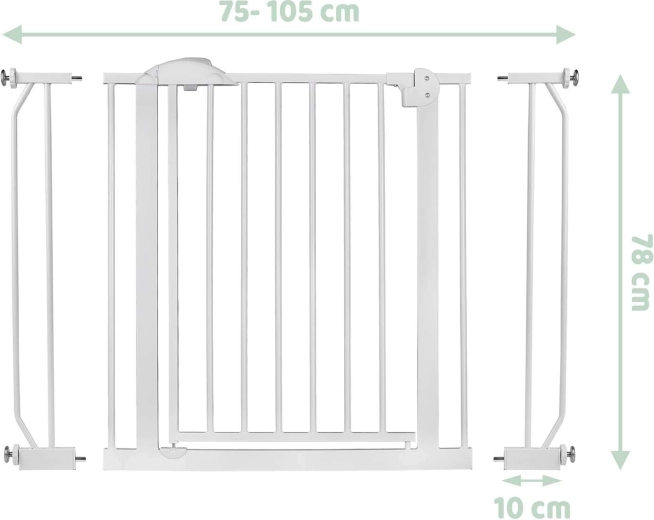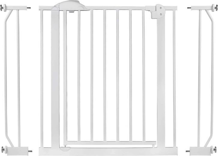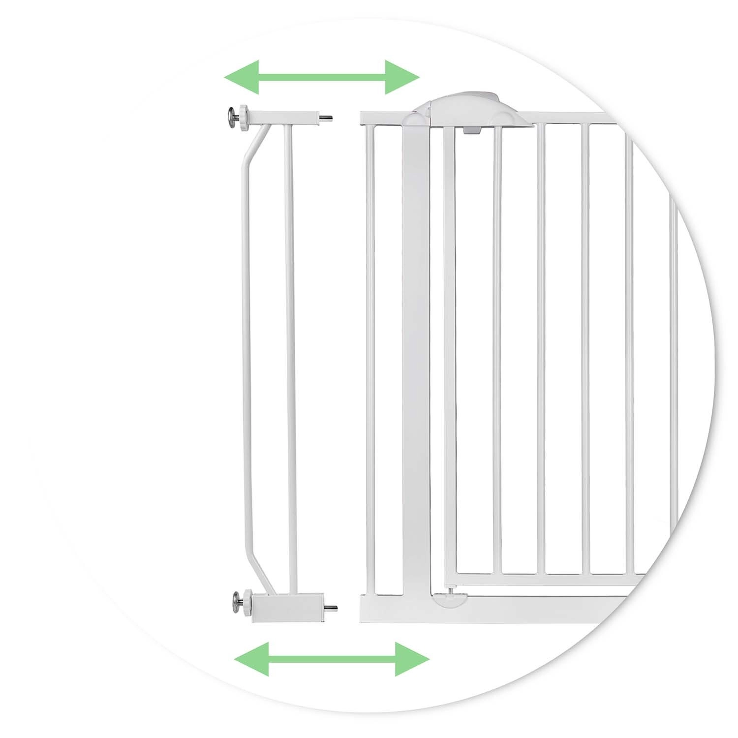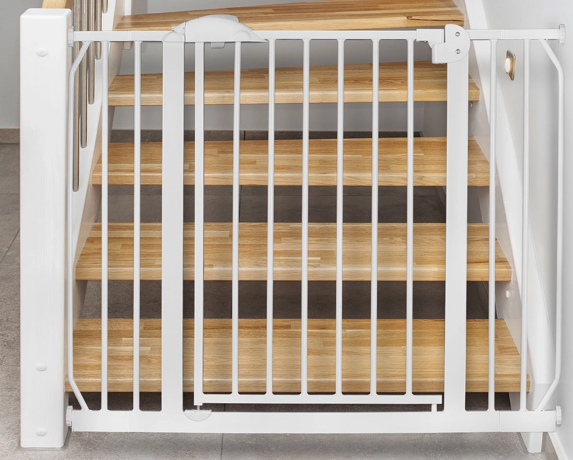 A folyamatosan állítható 75–105 cm szélességnek és a mellékelt hosszabbítóknak köszönhetően a kapu a legtöbb ajtóhoz és átjáróhoz egyszerűen igazítható. A kapu két irányba nyitható, egy kézzel kezelhető, szükség esetén egyirányú nyitásra zárolható vagy 90°-ban rögzíthető a kényelmes áthaladás érdekében.