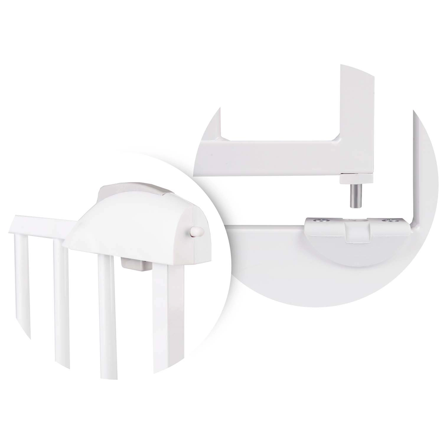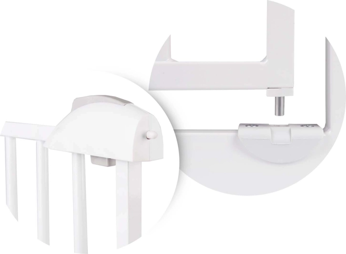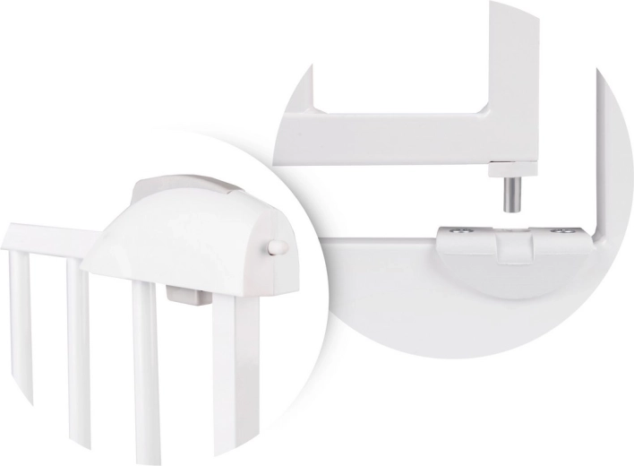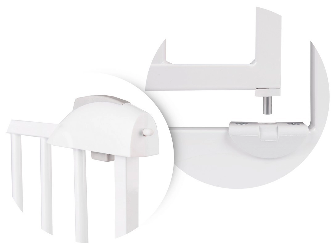 A NUKIDO biztonsági kapu ideális megoldás átjárók és lépcsők védelmére. A fúrás nélküli, feszítőszerelés óvja a falakat és a tokokat, míg a masszív fém szerkezet és a megbízható zármechanizmus biztonságban tartja a gyerekeket. A semleges fehér dizájn illik bármely enteriőrbe.
