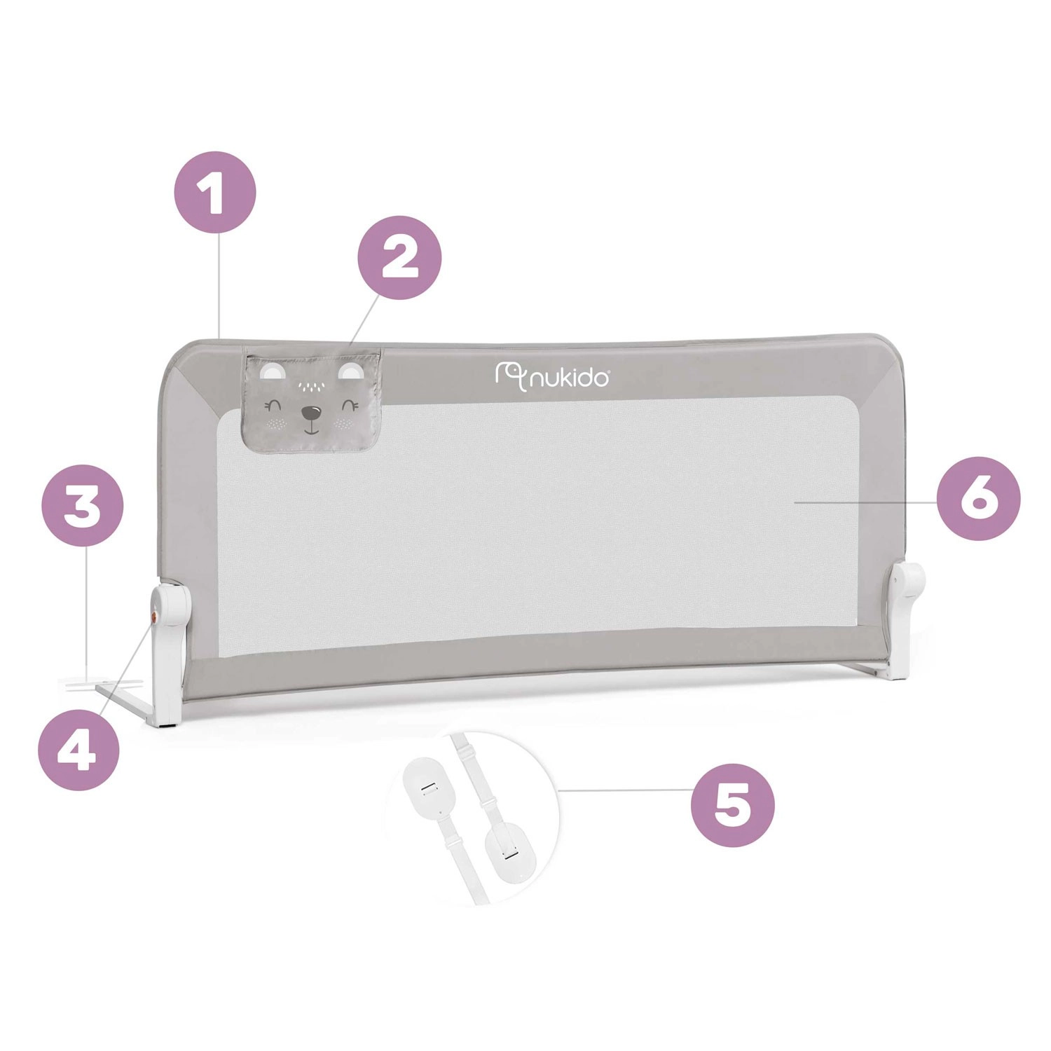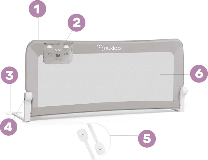 A praktikus, szürke színű Nukido gyerek ágyleesés-gátló megóvja a gyermeket az ágyról való leeséstől, és nyugodt alvást biztosít. Kínál strapabíró acélkeretet, légáteresztő hálót a jobb rálátás és levegőáramlás érdekében, akár 180°-os lehajthatóságot, valamint gyors szerelést csavarokkal vagy SafetyBelt biztonsági hevederekkel. Tartozik hozzá biztonsági retesz a véletlen összecsukódás ellen és praktikus zseb apróságoknak. Megfelel a szigorú európai szabványoknak: BS 7972:2001 + A1:2009.
