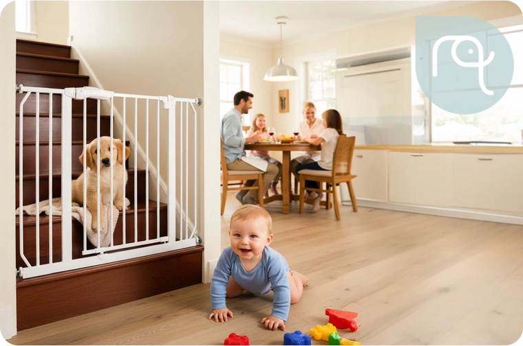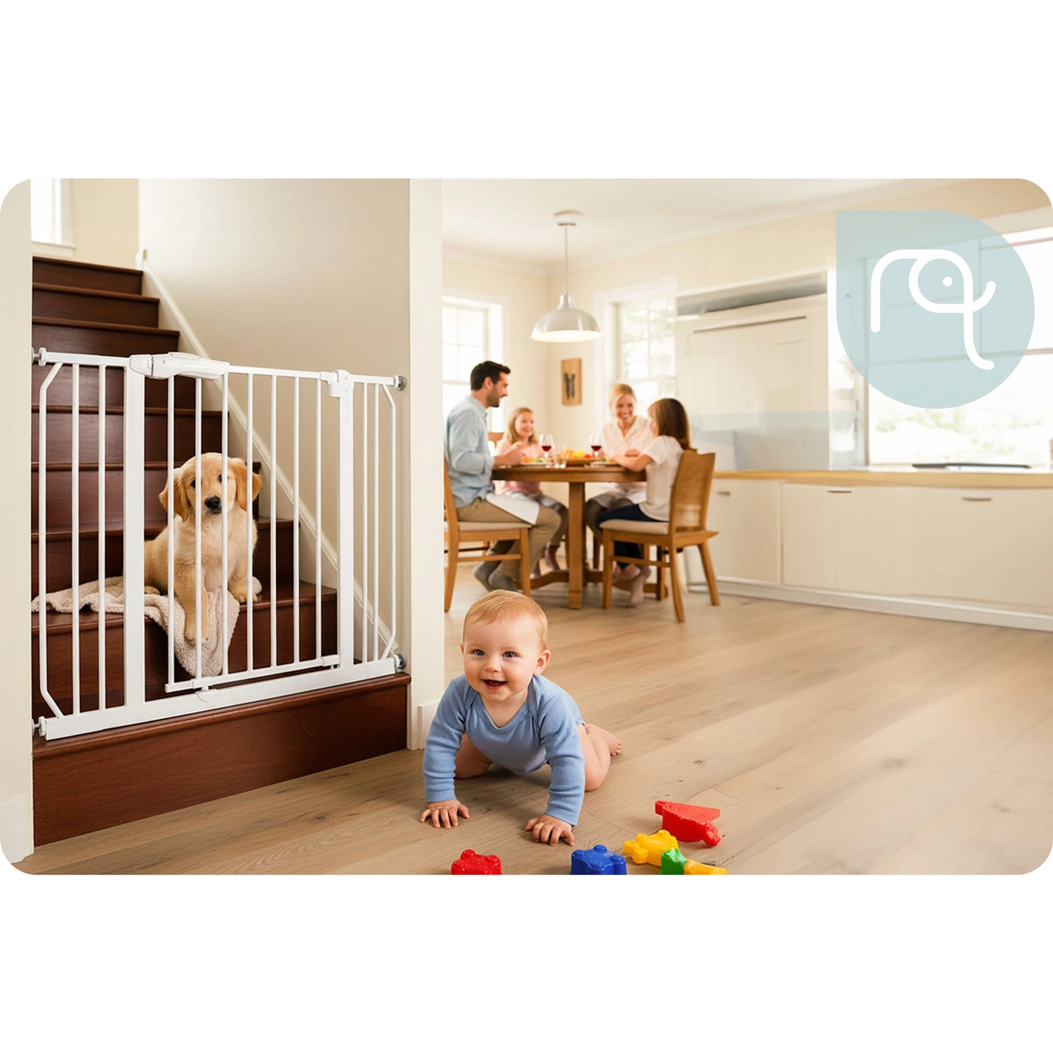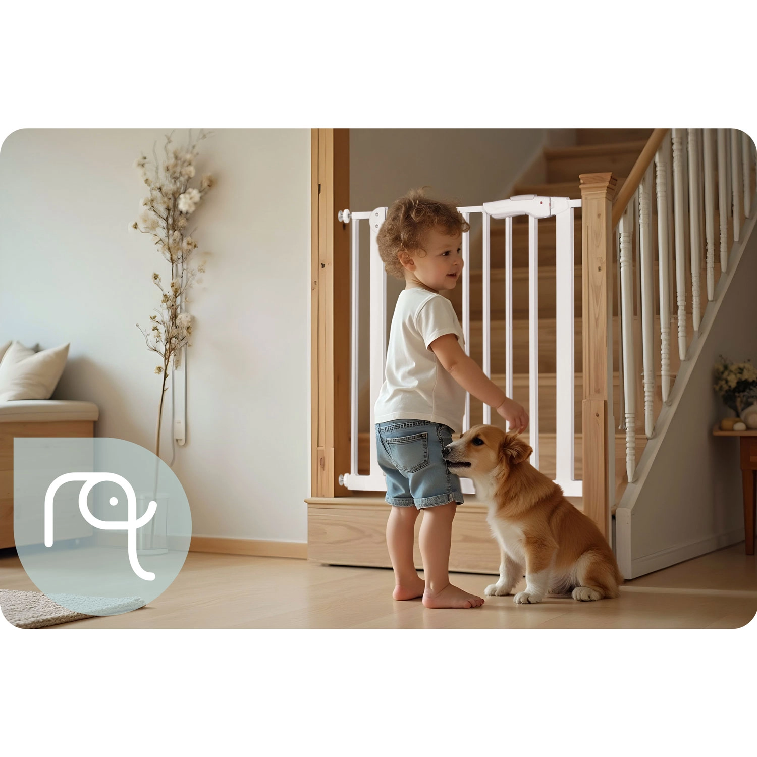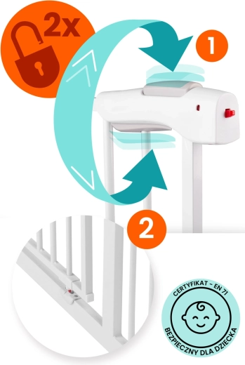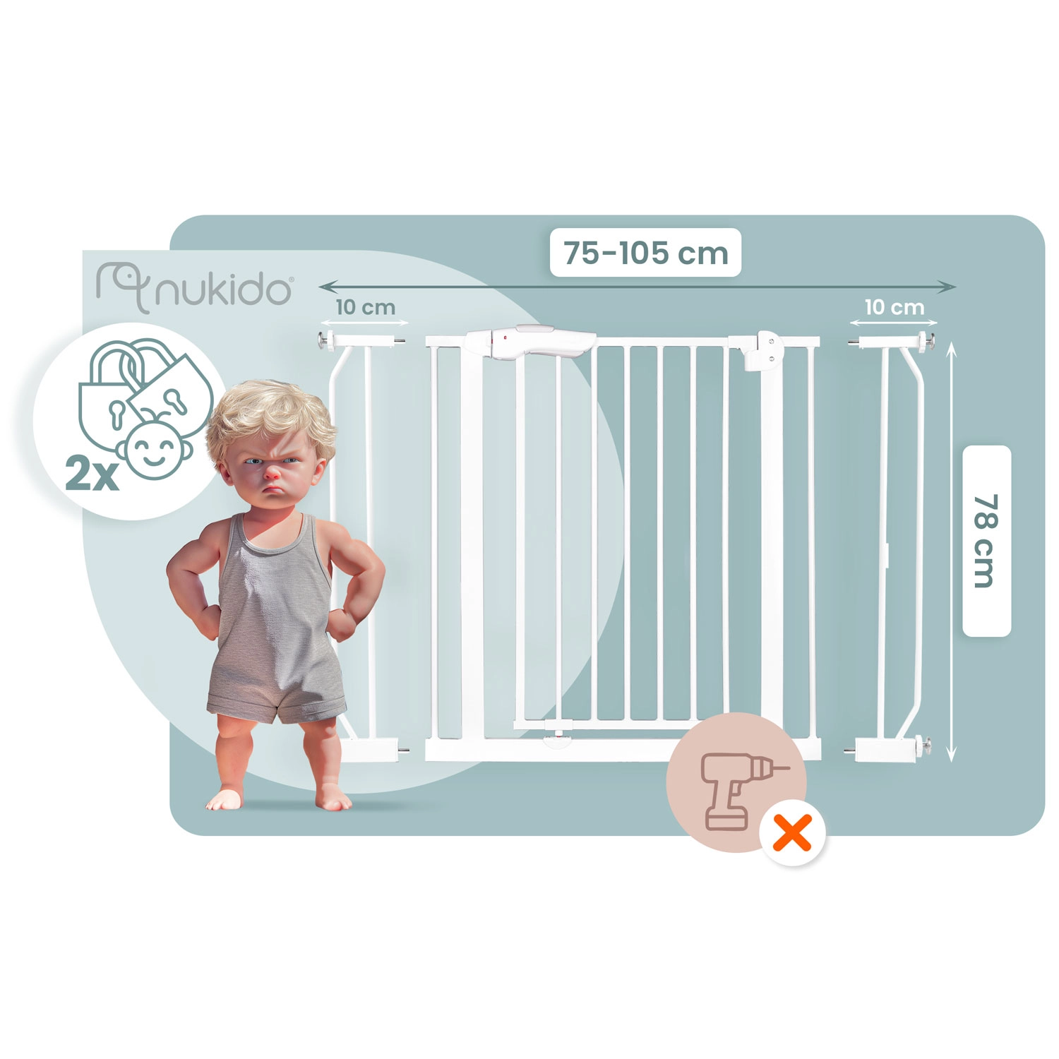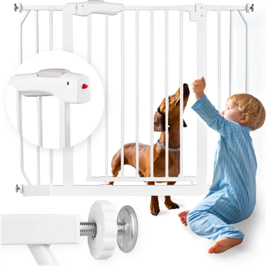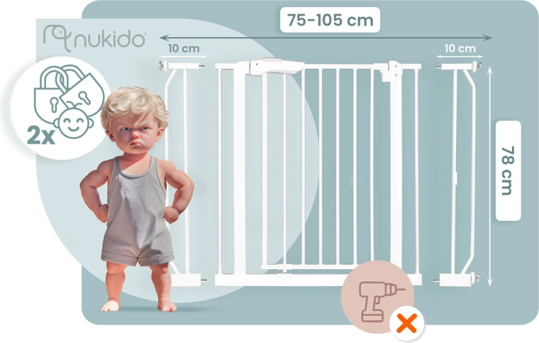 A NUKIDO biztonsági kapu elegáns fehér színben a legtöbb enteriőrbe illeszkedik, és a feszítős rögzítésnek köszönhetően néhány perc alatt felszerelhető – a fal vagy az ajtókeret sérülése nélkül. A robusztus fém kivitel és az EN 1930:2011 tanúsítvány megbízható védelmet nyújt a gyermekeknek és a kisebb háziállatoknak.