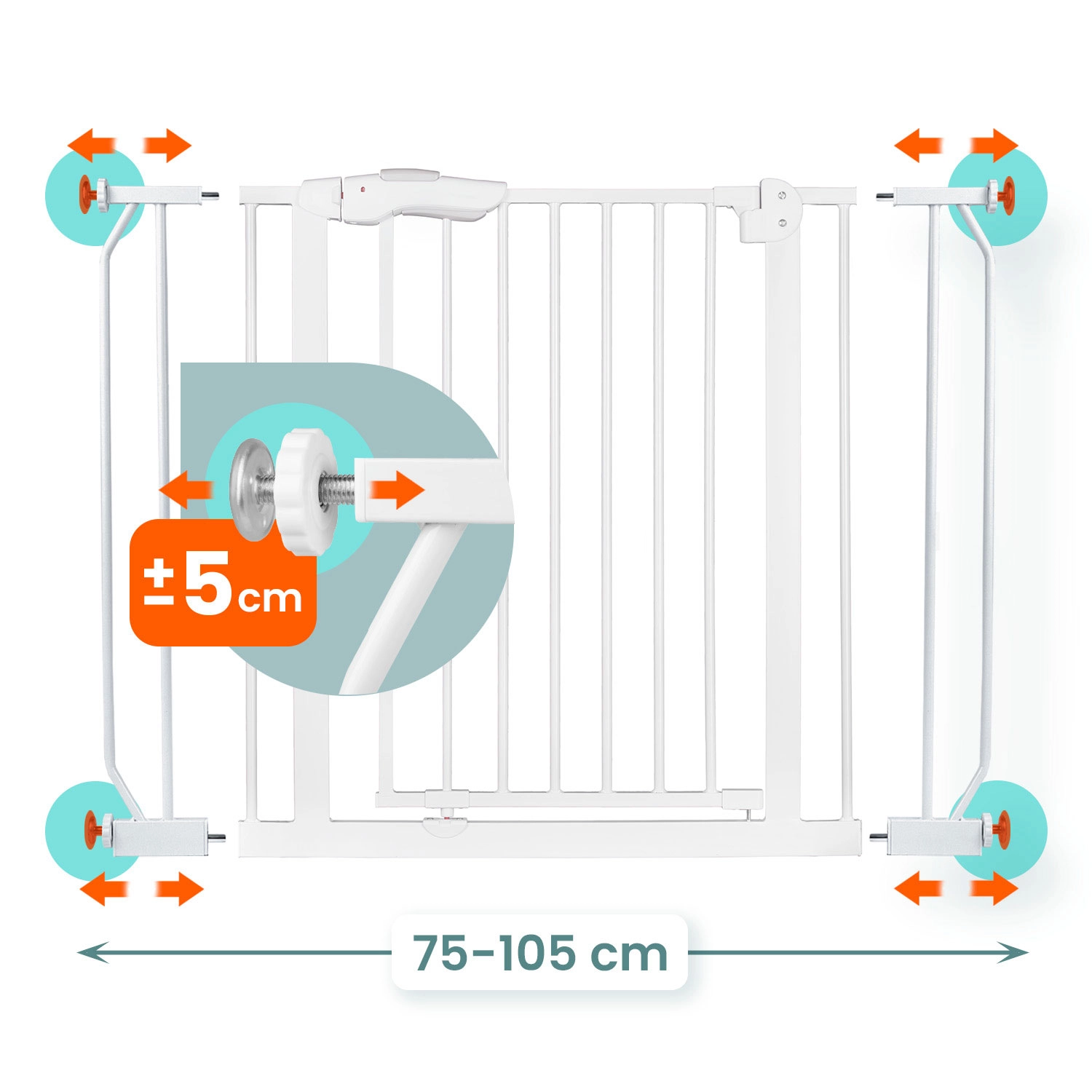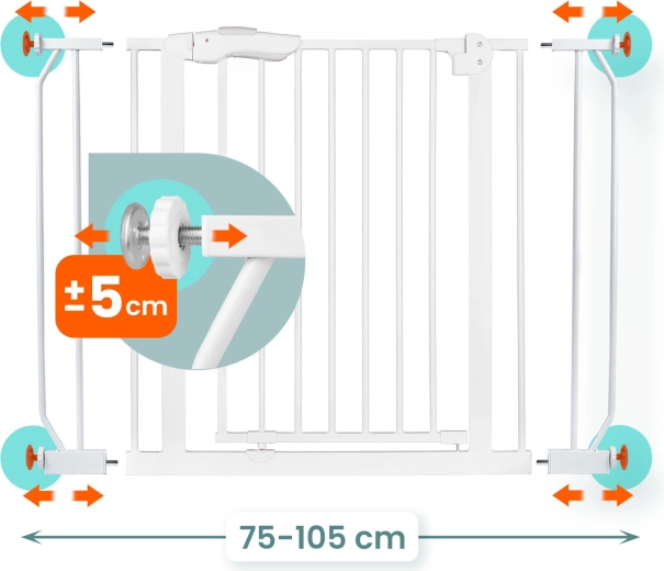 A csomag tartalmaz toldóelemeket és szélességállítókat, melyekkel a kapu könnyen beállítható 75–105 cm szélességű átjárókhoz. Ideális ajtókhoz és lépcsők elejére vagy végére.