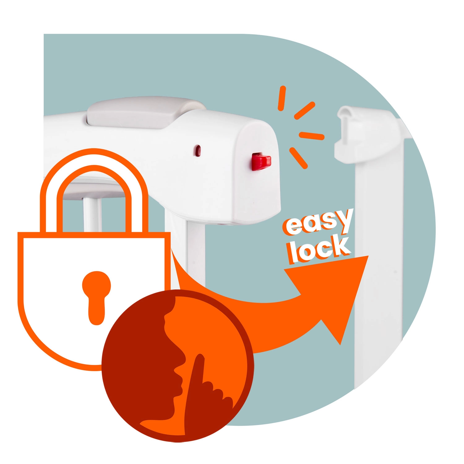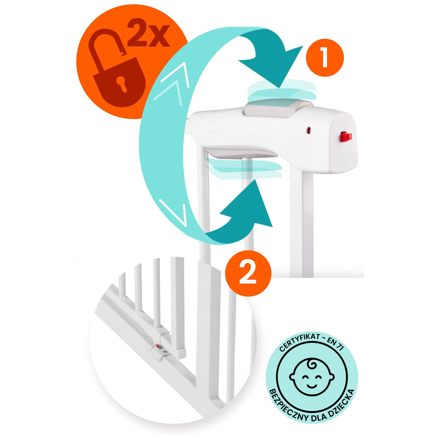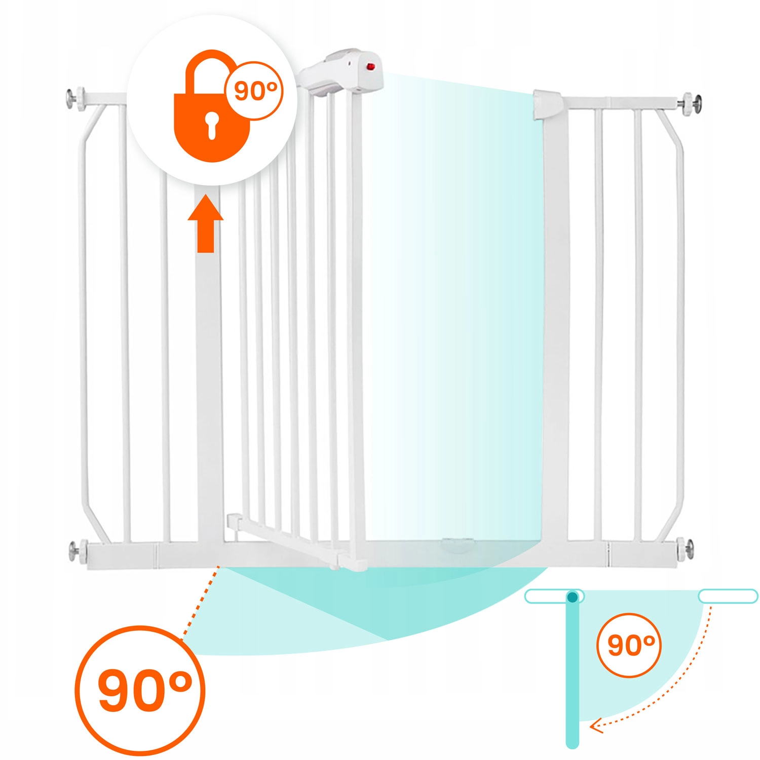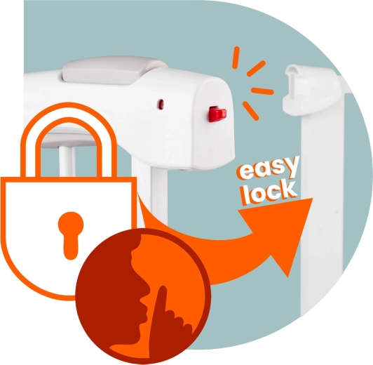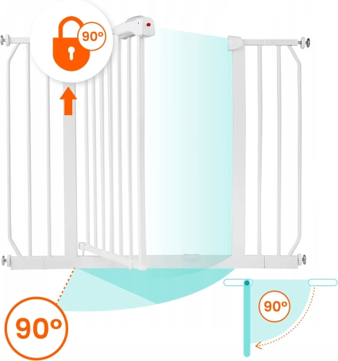 A működtetés felnőttekre tervezett: a kettős reteszelés a felső, majd az alsó gomb megnyomását igényli, ami a gyerekeknek nehéz, Önnek viszont intuitív. A kapu egy kézzel nyitható, a zárás egyenletes és csendes. A kétirányú nyitásnak és a 90°-os nyitási pozícióban történő rögzíthetőségnek köszönhetően az átjárás mindig kényelmes.