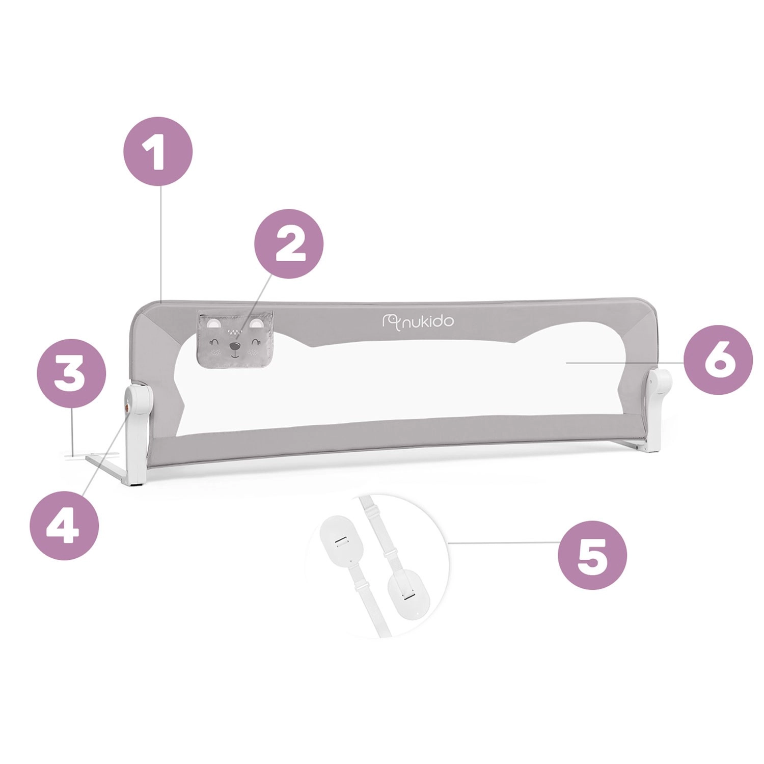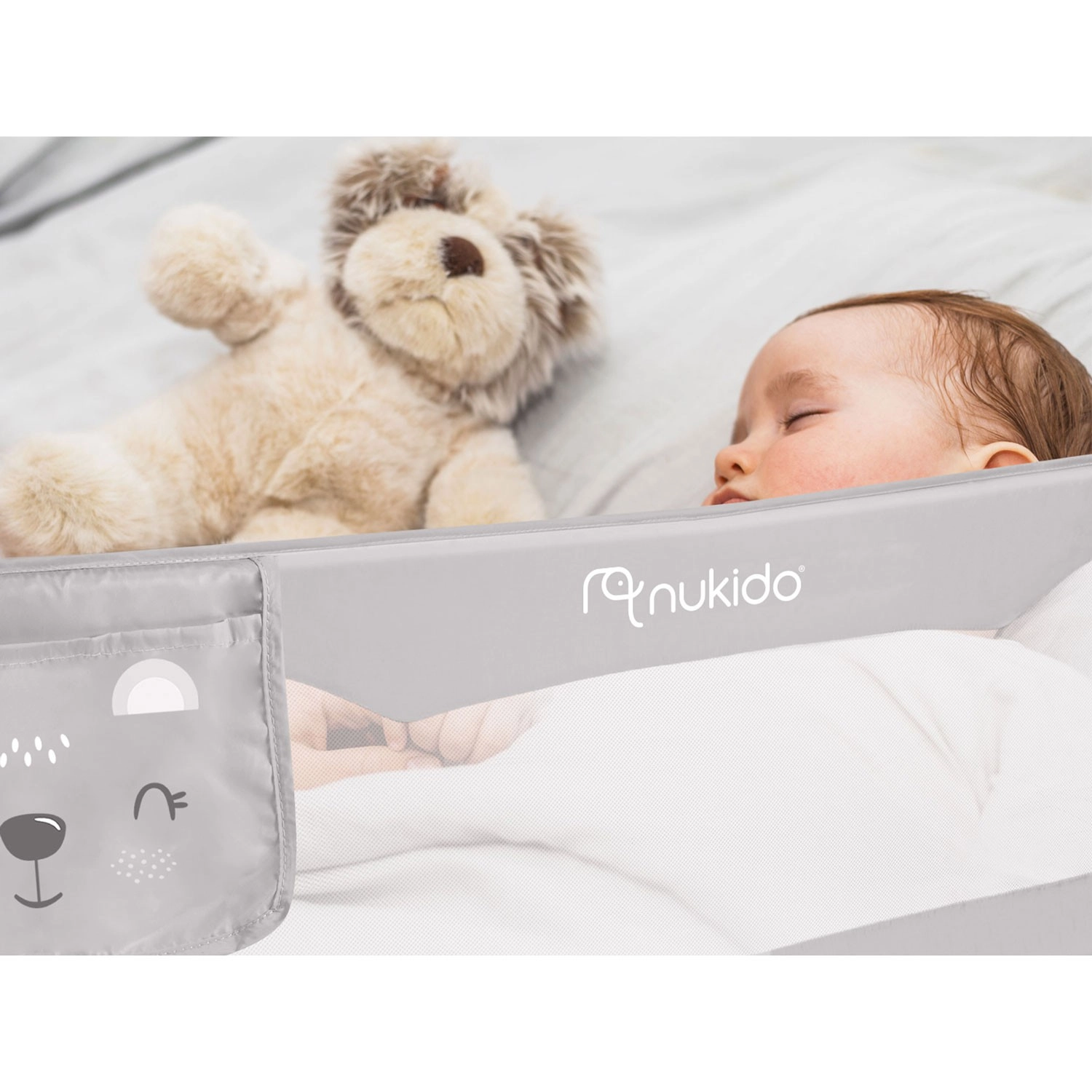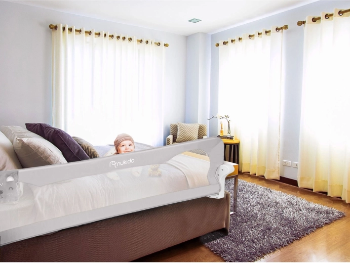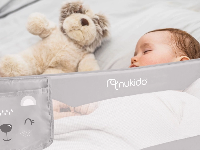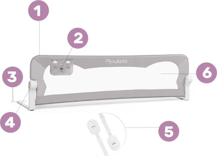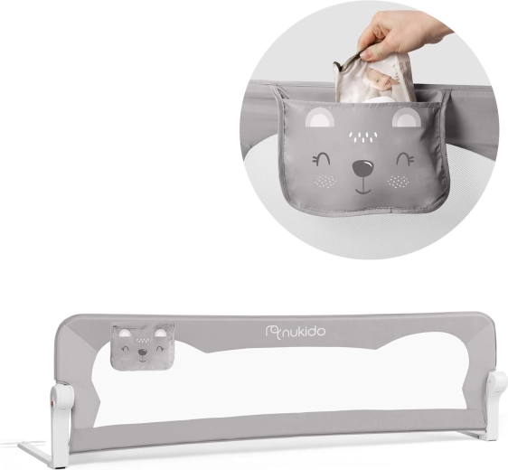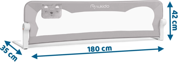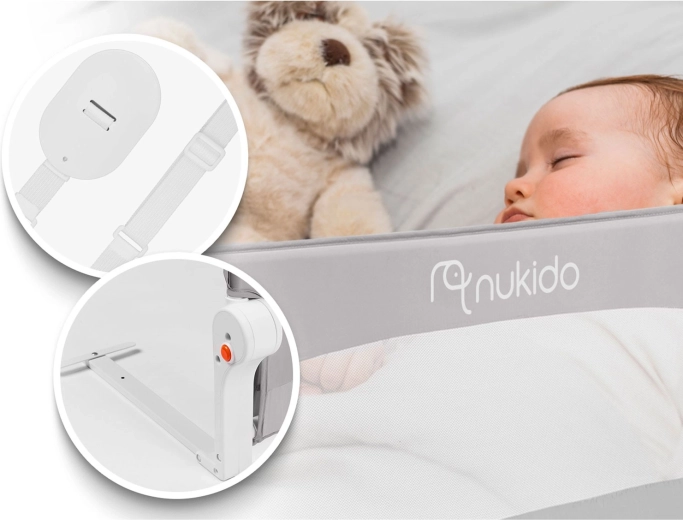 A biztonságos és praktikus Nukido ágyvédő rács megóvja a gyermeket az ágyról való leeséstől, miközben a légáteresztő hálónak köszönhetően könnyű a rálátás. Masszív acélkerettel rendelkezik, akár 180°-ban lehajtható, és biztonsági zárral van ellátva a véletlen lecsukódás ellen. Gyorsan felszerelhető az ágykeretre, a SafetyBelt hevederek pedig extra stabilitást biztosítanak. A praktikus zseb apróságoknak mindent kéznél tart. Megfelel a BS 7972:2001+A1:2009 szabványnak.