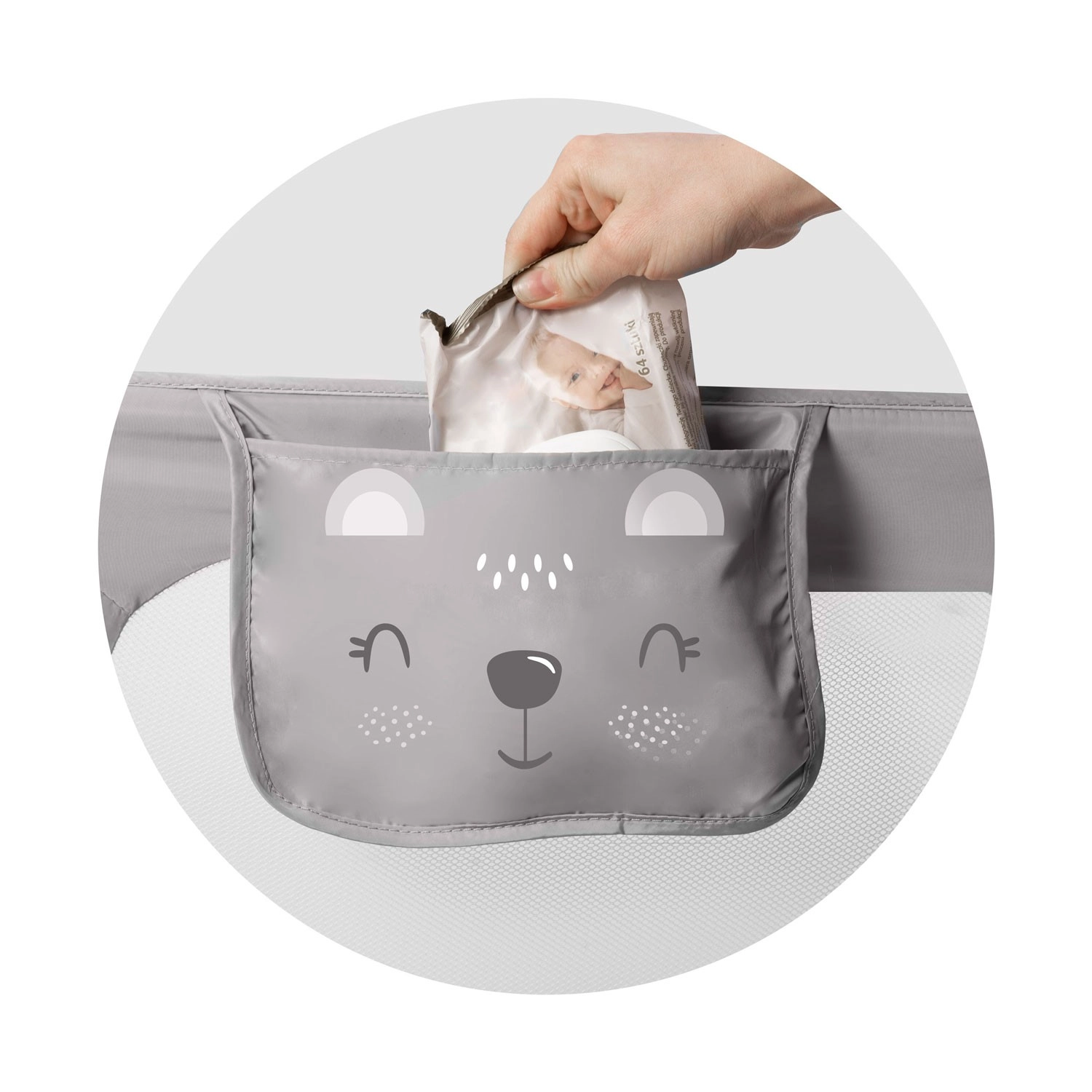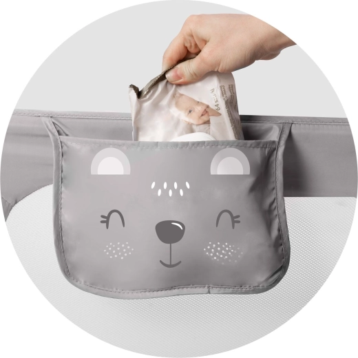 A szerelés gyors és rugalmas: a rács közvetlenül az ágykerethez csavarozható, vagy SafetyBelt hevederekkel rögzíthető – a legnagyobb stabilitásért a két módszer kombinálható. A biztonsági zár megakadályozza a nem kívánt lecsukódást használat közben, a praktikus zseb pedig a cumit, törlőkendőt vagy kis játékokat mindig kéznél tartja.