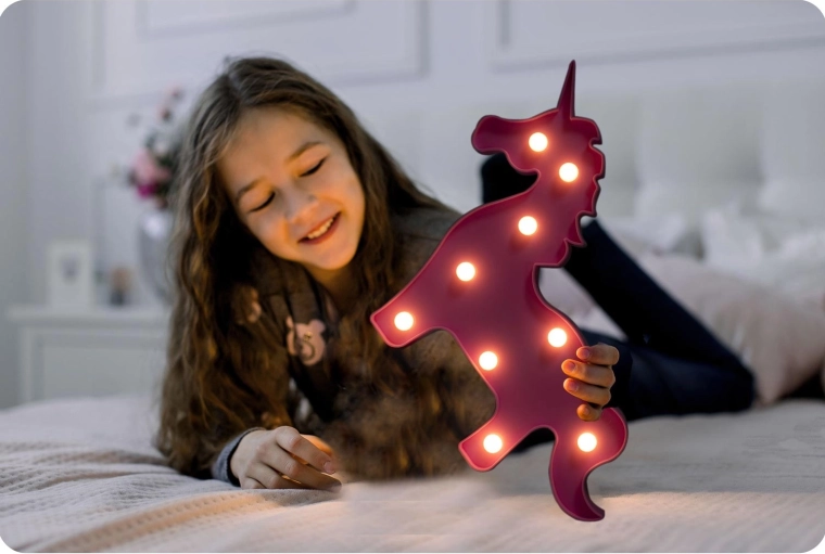 A NUKIDO unikornisos éjszakai LED lámpa játékos kiegészítő a gyerekszobába, amely a bájos dizájnt praktikus funkcionalitással ötvözi. A puha, nem vakító fény kellemes környezetet teremt az elalváshoz, olvasáshoz és az éjszakai tájékozódáshoz. A 2× AA elemes tápellátásnak köszönhetően bárhová könnyen áthelyezhető – az éjjeliszekrényre, polcra vagy a gyereksátorba.