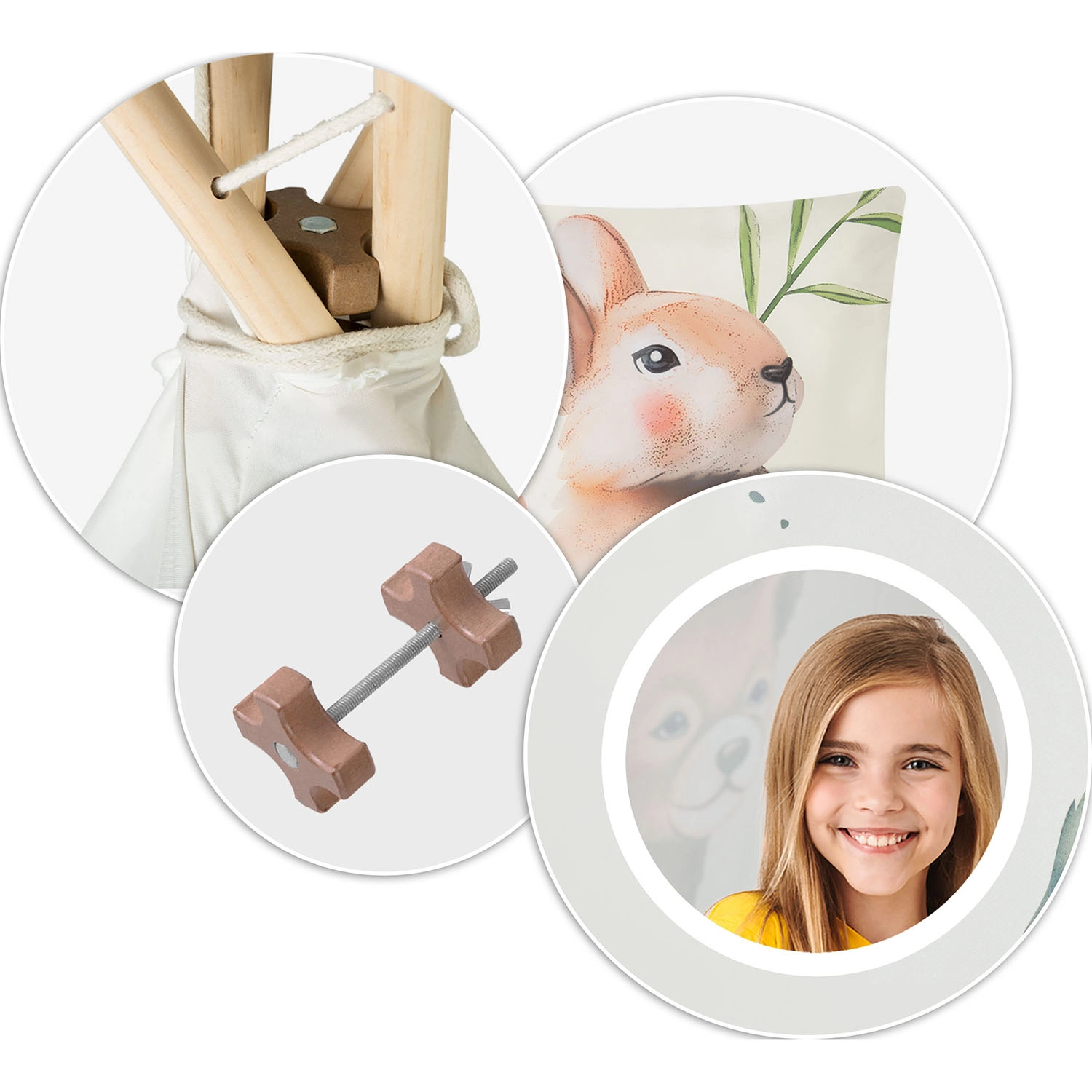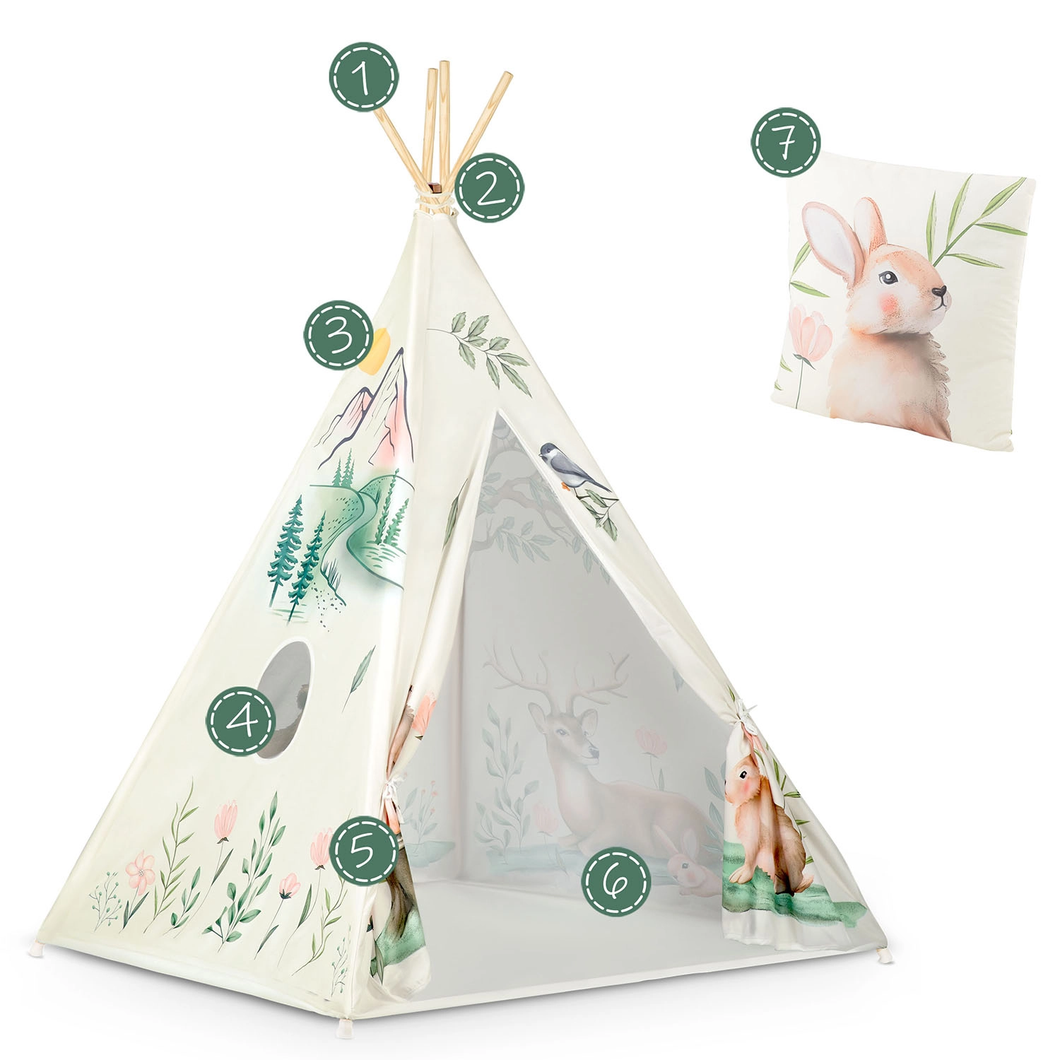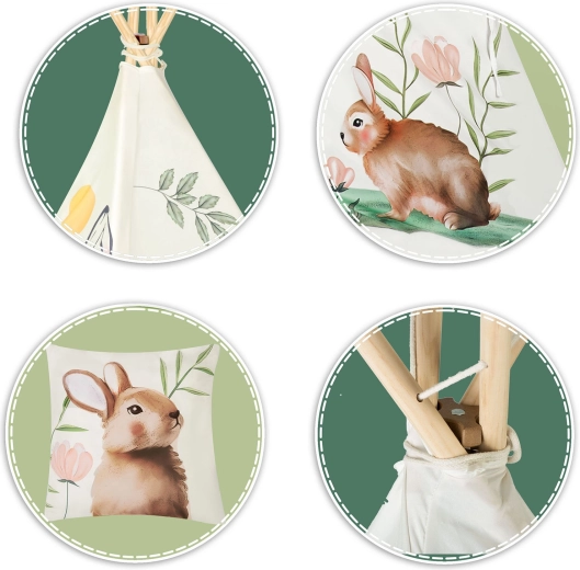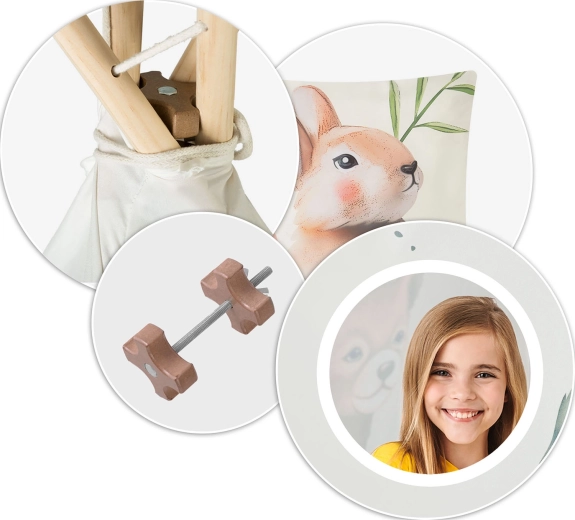 A dizájn egy, gyermektermékekre specializálódott tervezővel együttműködésben készült. A harmonikus színek és az egyedi illusztrációk támogatják az érzékelés és az esztétikai ízlés fejlődését. A praktikus részletek, mint a kerek ablak, a beköthető bejárat és a bevarrt alj maximális kényelmet nyújtanak. A csomagban egy puha, nyuszis párnát is talál, még meghittebb kuckóért.