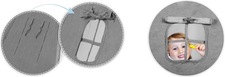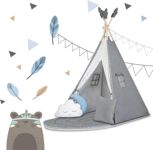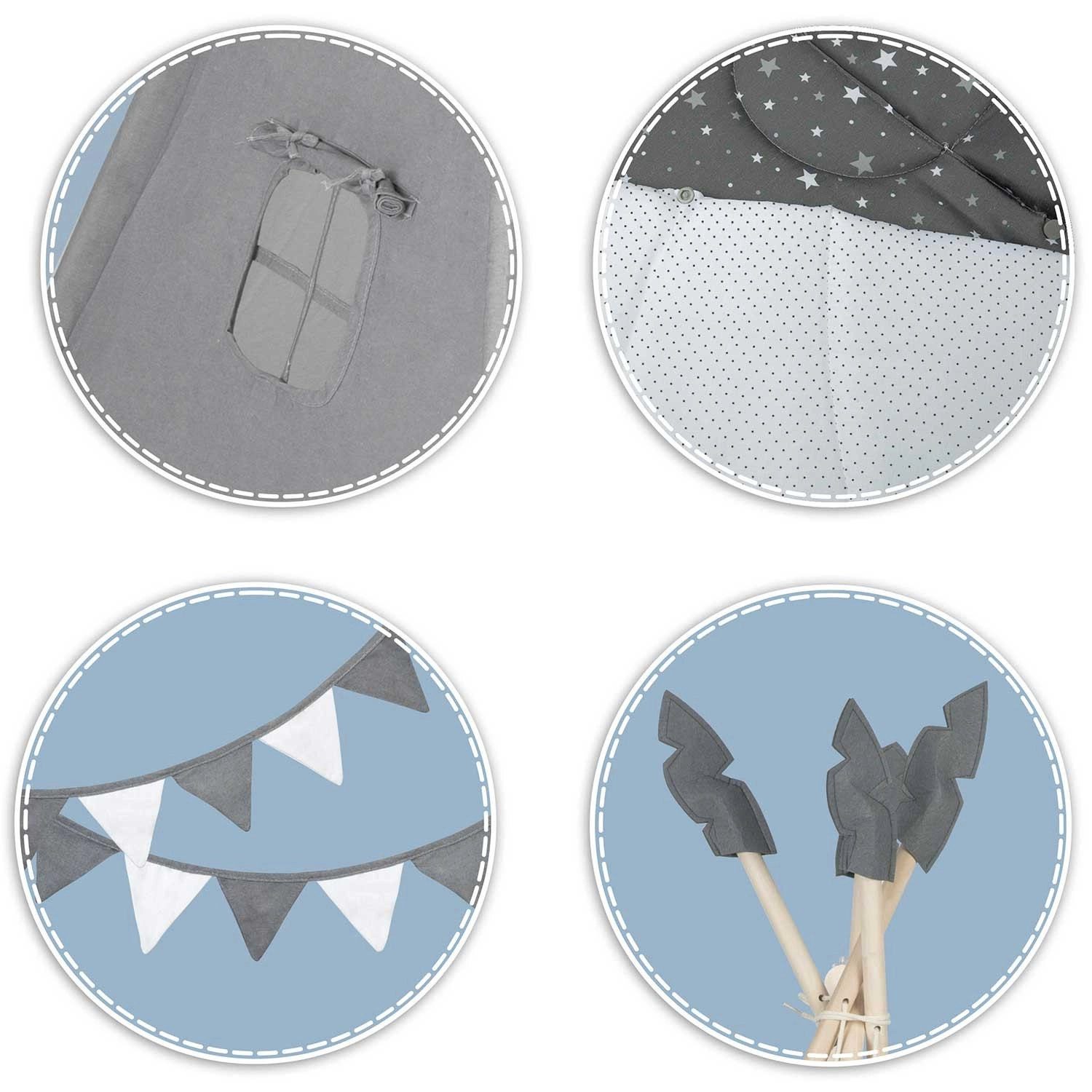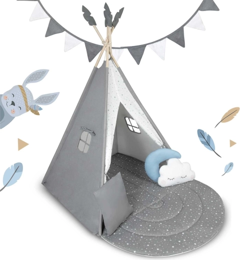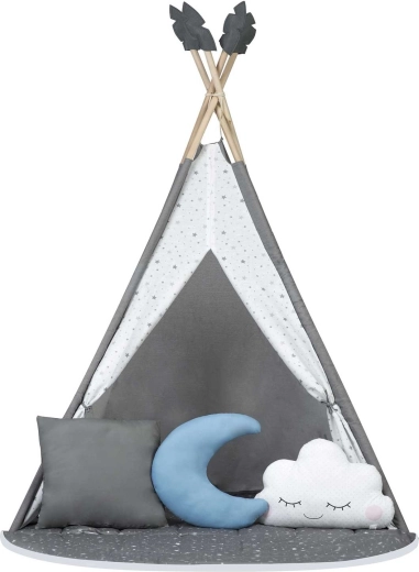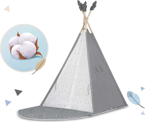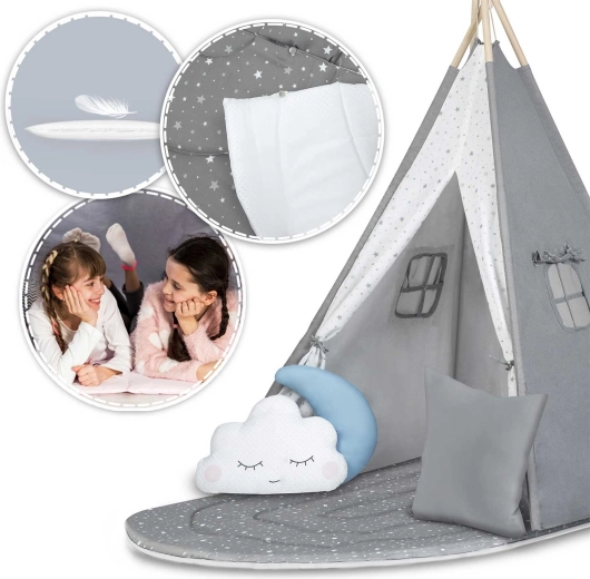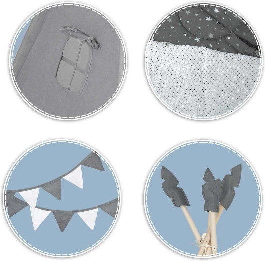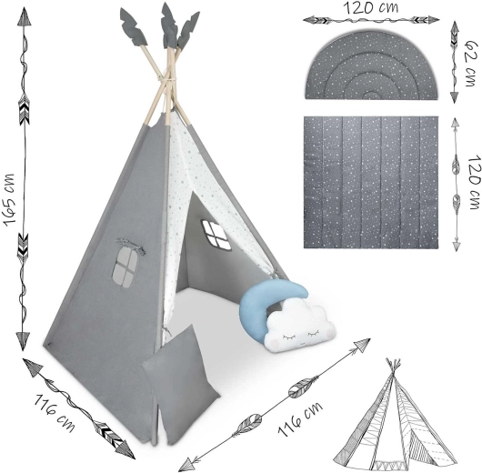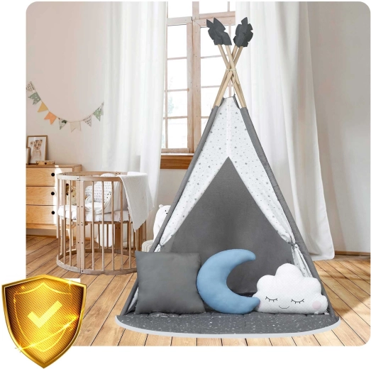 A NUKIDO tipi a gyerekek igényei szerint készült – puha és tartós, prémium pamutot tartalmazó keverékanyagból a kiváló szellőzésért és kényelemért. A 175 g/m²-es nagyobb szövetgrammsúly puhaságot és tartósságot biztosít, így a sátor gond nélkül bírja a mindennapi kalandokat. A harmonikus szürke árnyalatok csillagmintával szépen illeszkednek az enteriőrhöz, és támogatják a gyermek érzékszervi fejlődését.