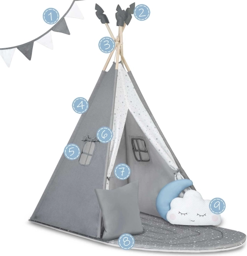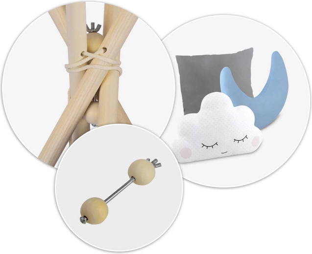 4 fa rúd, ajándék stabilizátor, girland, 4 filc toll és 3 párna (négyzet, hold, felhő) alkotják a komplett, játékos búvóhelyet.