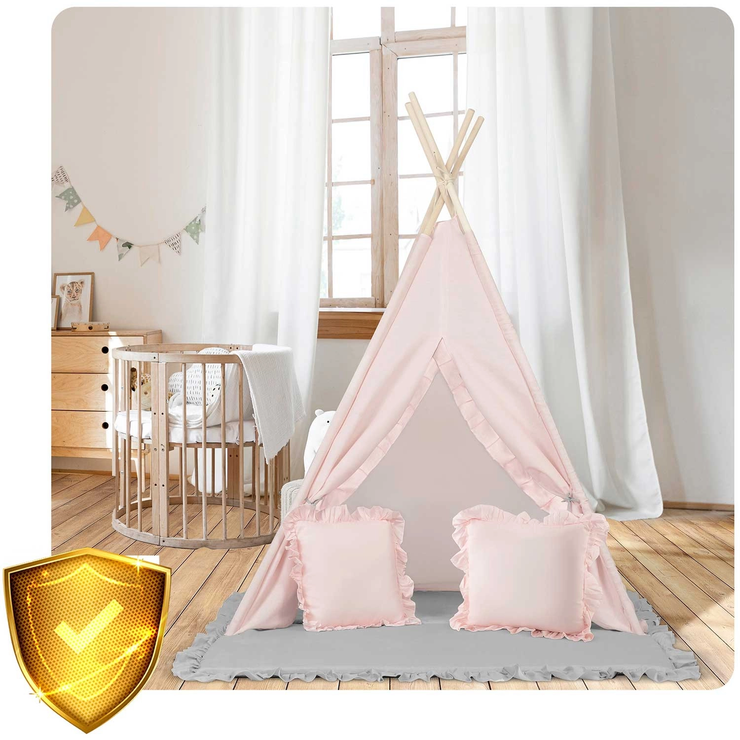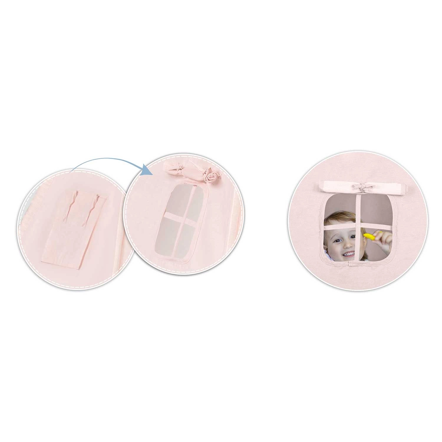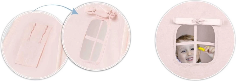 Része az extra vastag, csúszásgátlós szigetelő alátét a puha és meleg üldögéléshez, valamint két párna (négyzet és szív) a még nagyobb kényelemért. A nyitható ablak rolettával támogatja a fantáziát és a kapcsolattartást a szülőkkel, míg a girland és a díszítő részletek meghitt hangulatot teremtenek.