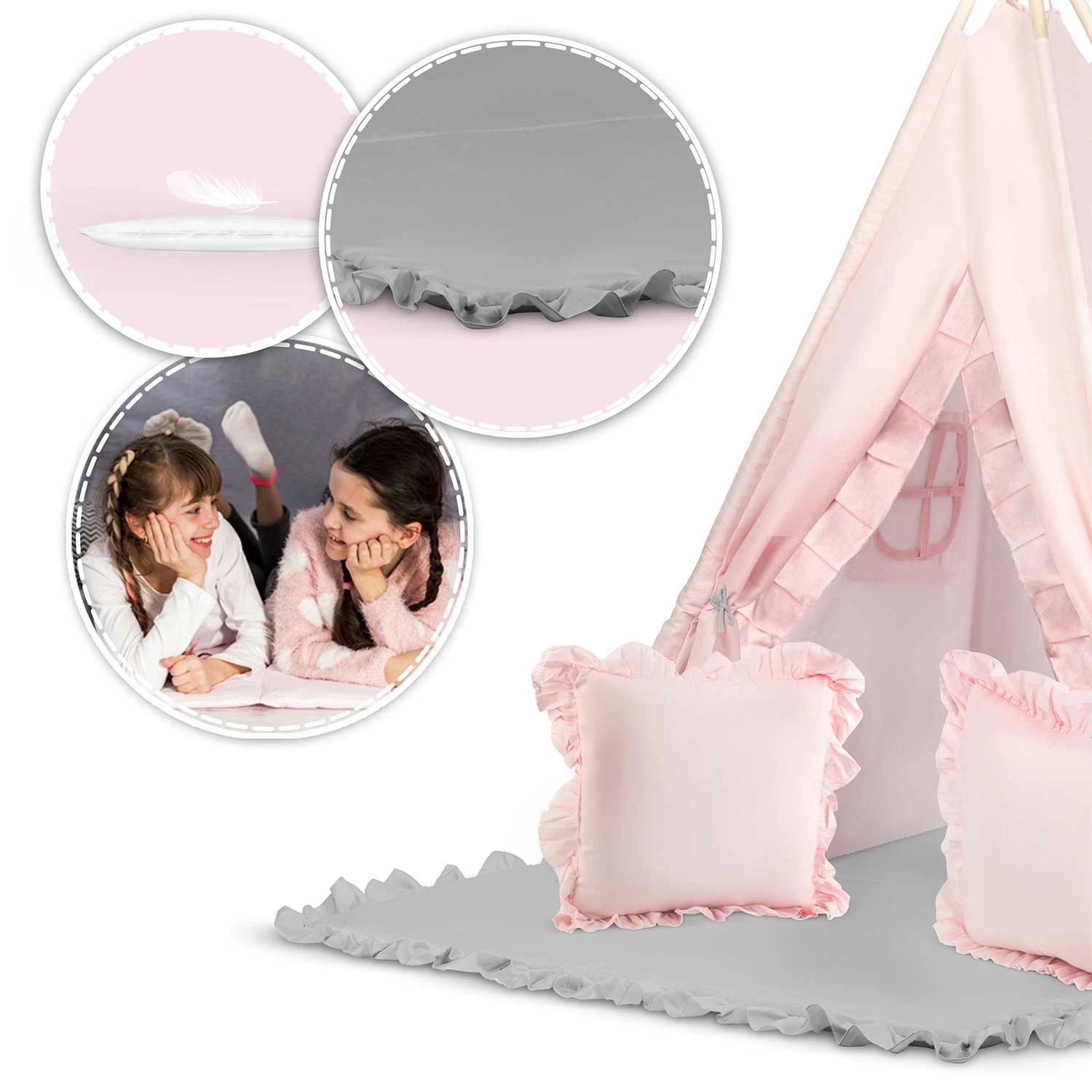 A vastag szigetelő alátét csúszásgátló pöttyökkel és két pihe-puha párna (négyzet és szív) meghitt kuckót teremt játékhoz és pihenéshez.