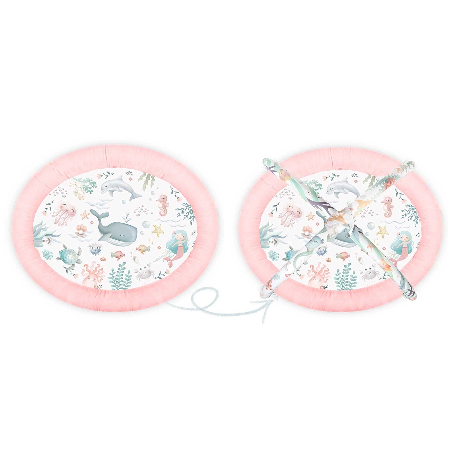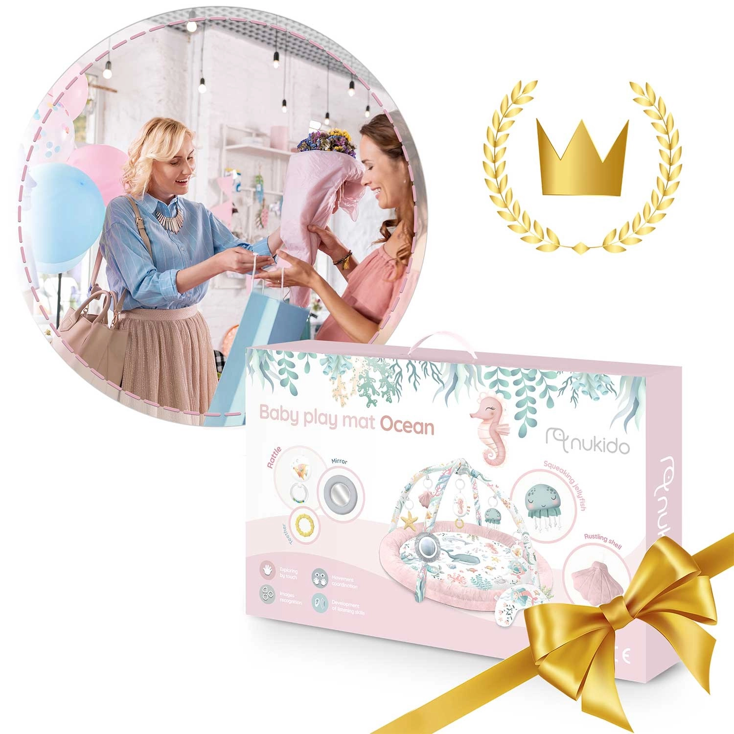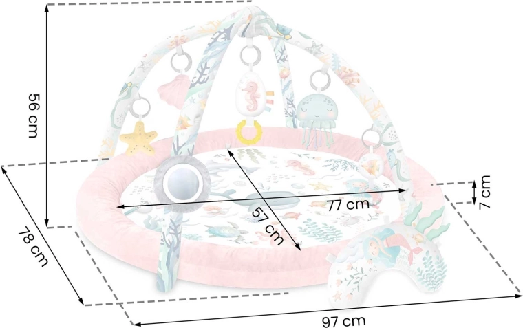 A Nukido Ocean – rózsaszín játszószőnyeg meghitt és biztonságos környezetet teremt a mindennapi játékhoz és pihenéshez. A levehető ívek színes tengeri motívumokkal és függő játékokkal természetes módon támogatják a látás, a tapintás és a mozgásfejlődés alakulását. A puha, tartós és könnyen tisztítható felületnek köszönhetően a szőnyeg készen áll a mindennapi kalandokra.