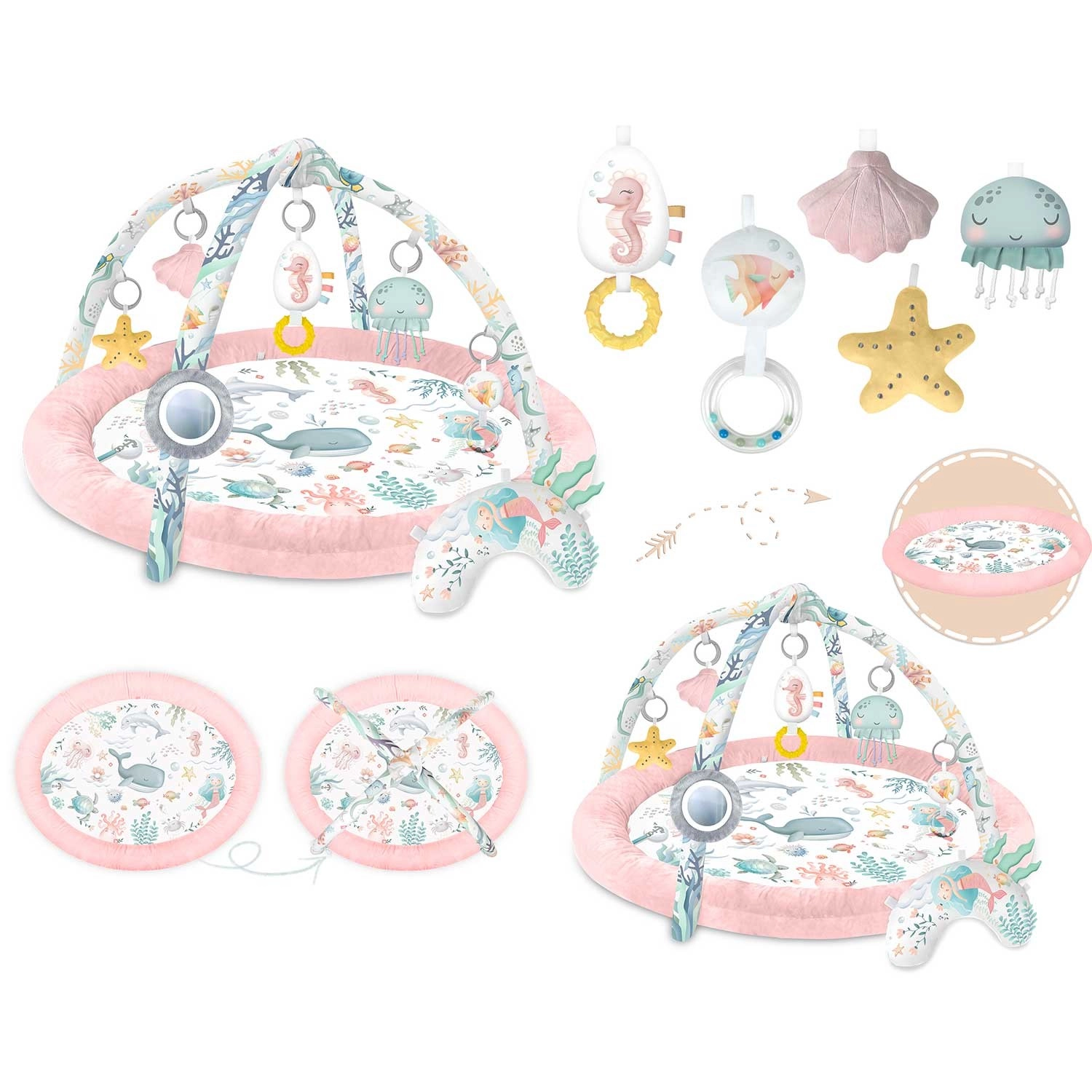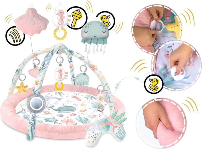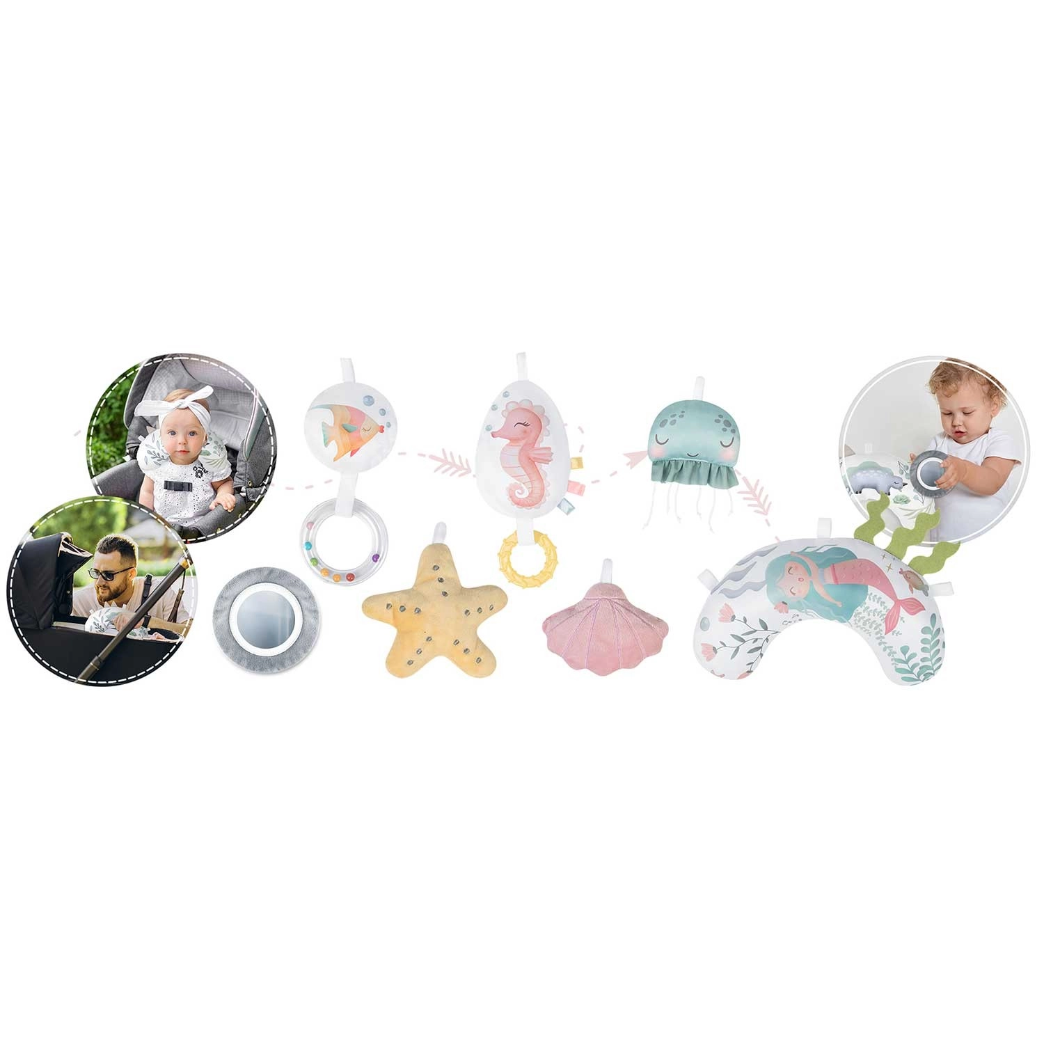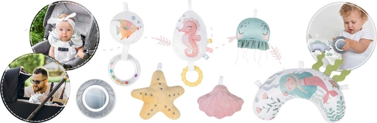 Tükör, csillag, kagylók, medúza, csikóhal és további elemek csörgő és zizegő hatásokkal serkentik a kíváncsiságot, a szem–kéz koordinációt és az első fogásokat.