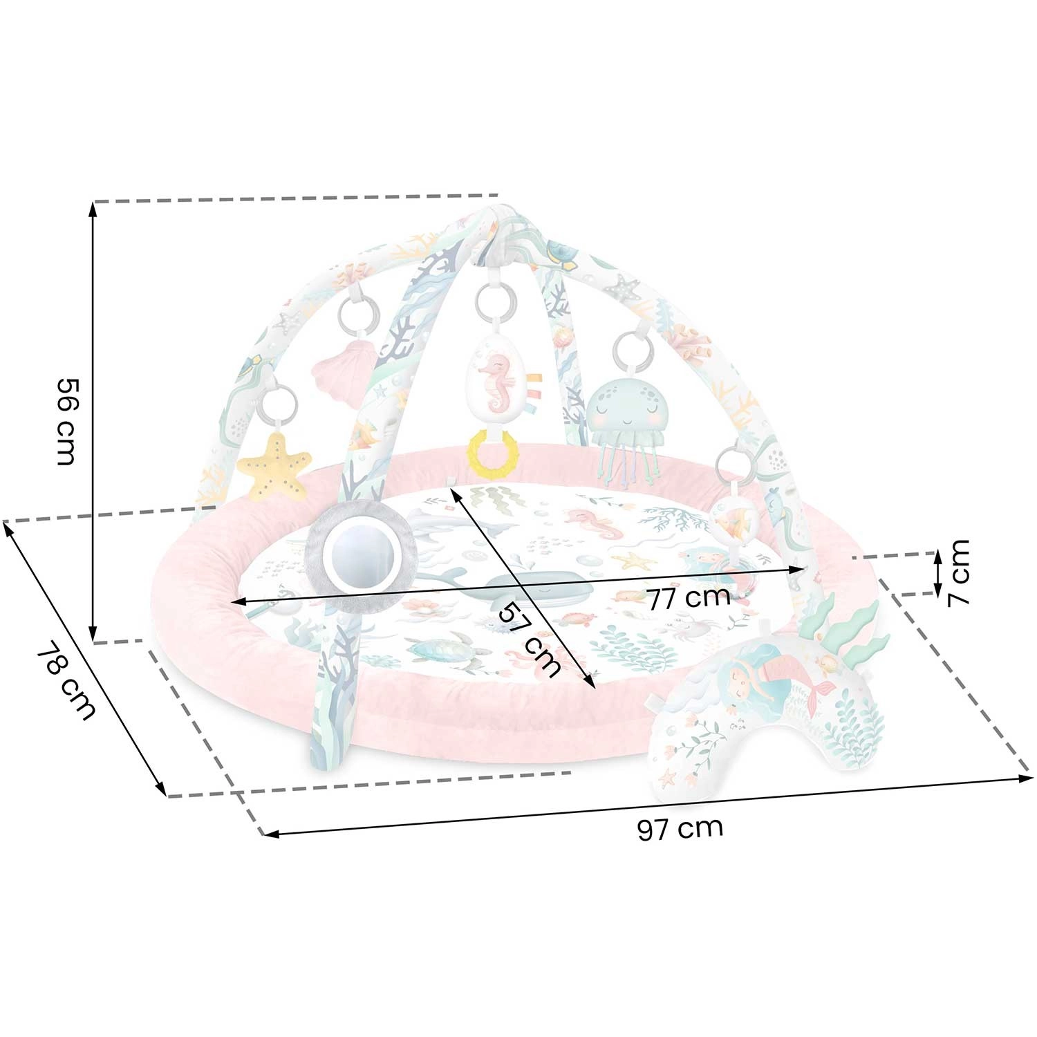 - Játszószőnyeg, beépített perem/ölelő rész, 2 levehető ív, 7 multifunkciós játék