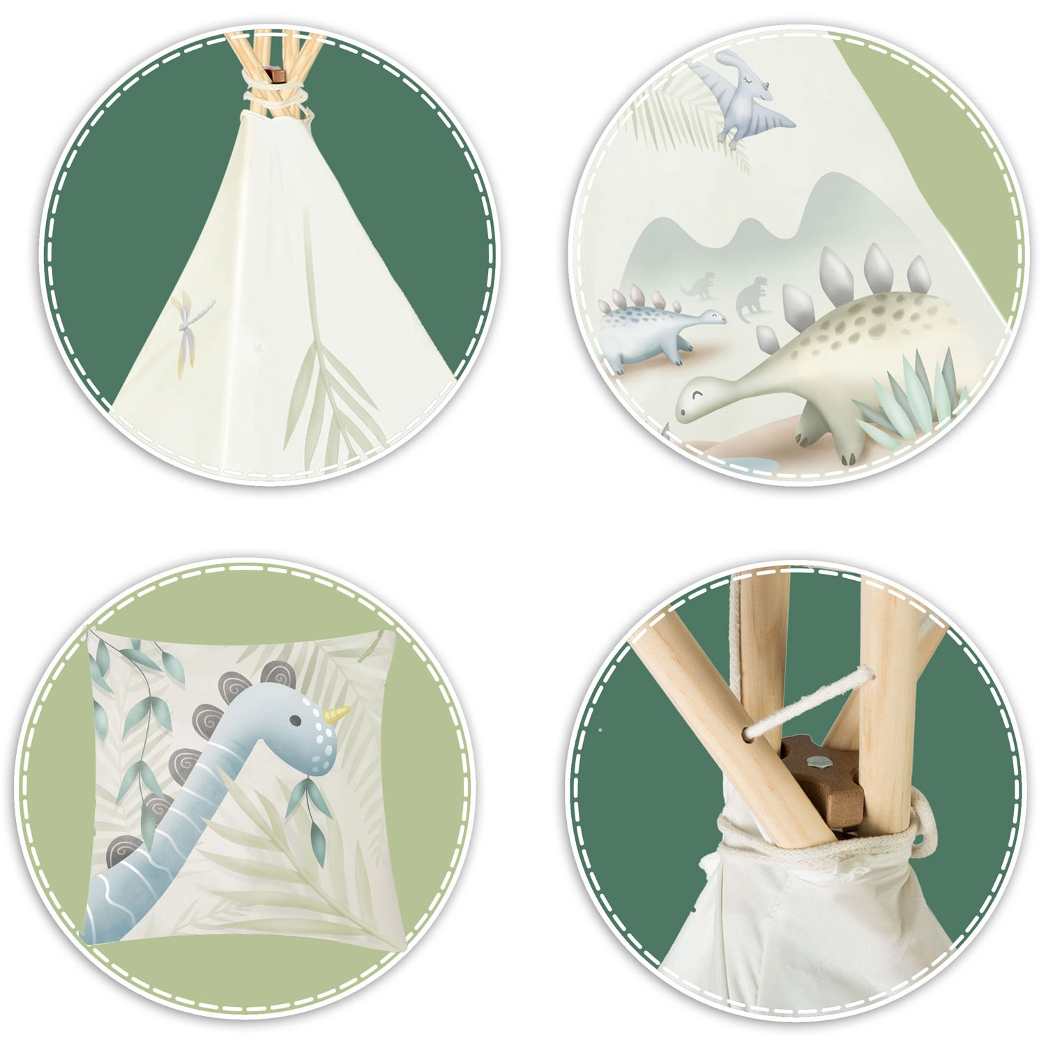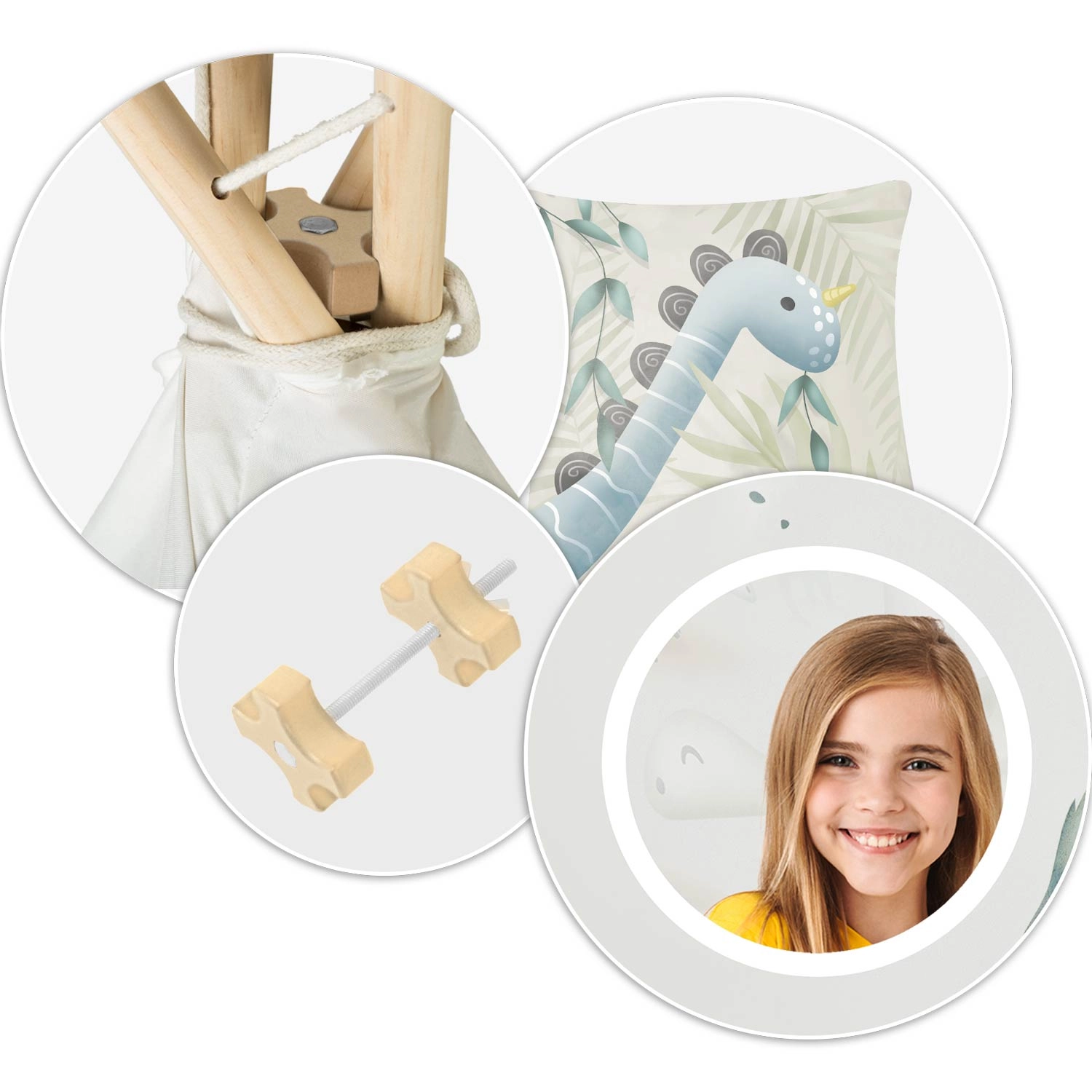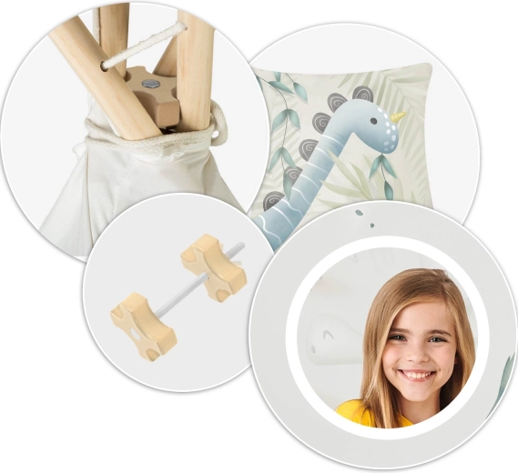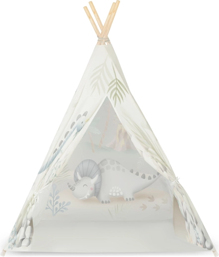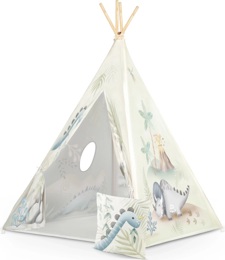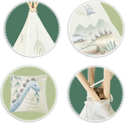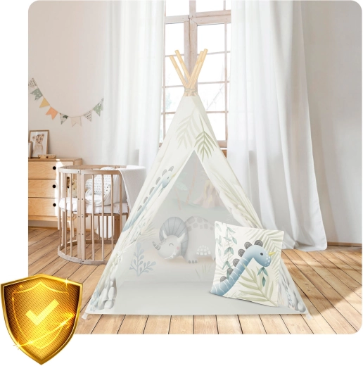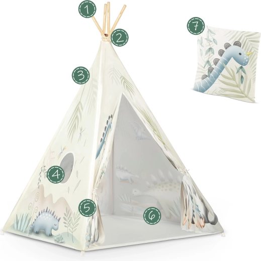 A NUKIDO teepee privát teret nyújt a gyerekeknek játékhoz, olvasáshoz és pihenéshez. A lágy pasztell színek és a dinoszaurusz grafika illeszkedik a modern enteriőrhöz és tiszteletben tartja a Montessori elveket – egyszerű formák, természetes anyagok és az önálló játék támogatása. A légáteresztő szövetnek és a kerek ablaknak köszönhetően odabent mindig kellemes a levegő.