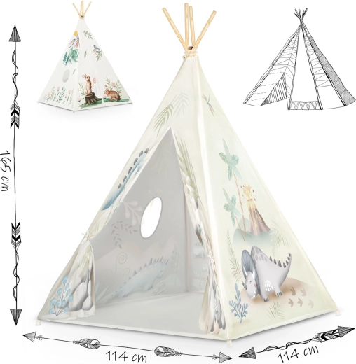 Négy fenyőfa rúd stabilizátorral és bevarrt padlóval gondoskodik róla, hogy a teepee ne mozduljon el, és a formáját vadabb játék közben is megtartsa.