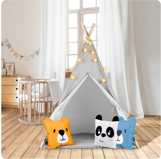 A szülőknek plusz előny: a teepee a minimalista Montessori stílust követi, és a semleges szürke színnek köszönhetően a legtöbb enteriőrhöz szépen illeszkedik. Az alátét önállóan is használható játékszőnyegként.