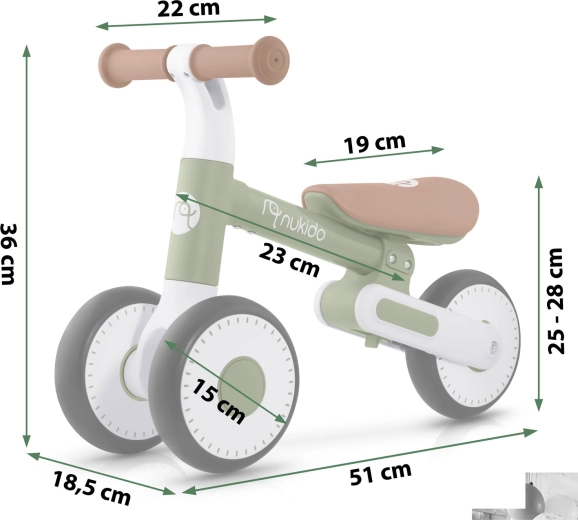 Támogasd a természetes egyensúly- és koordinációfejlődést a Nukido futóbiciklivel. A három kerékkel ellátott, extra stabil konstrukció, az alacsony átlépés és a puha, habszivacs ülés már az első lépésektől magabiztosságot ad. A 25–28 cm között állítható ülésmagasságnak köszönhetően a futóbicikli együtt nő gyermekeddel, megőrizve a megfelelő ergonómiát és kényelmet.
