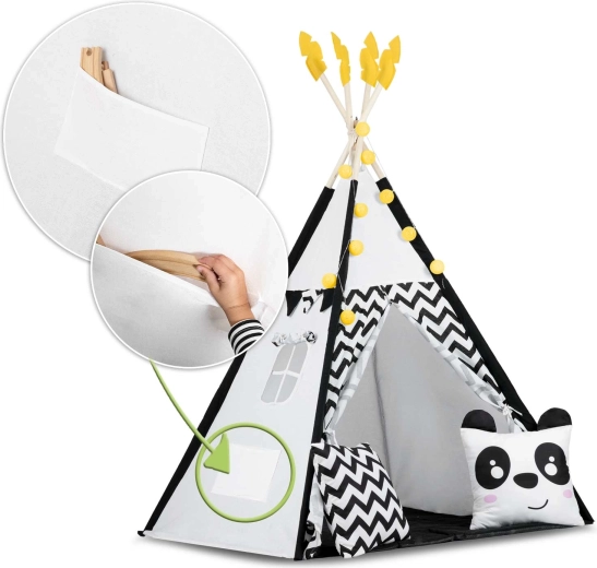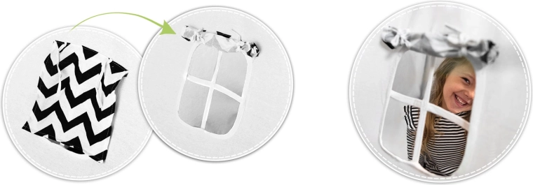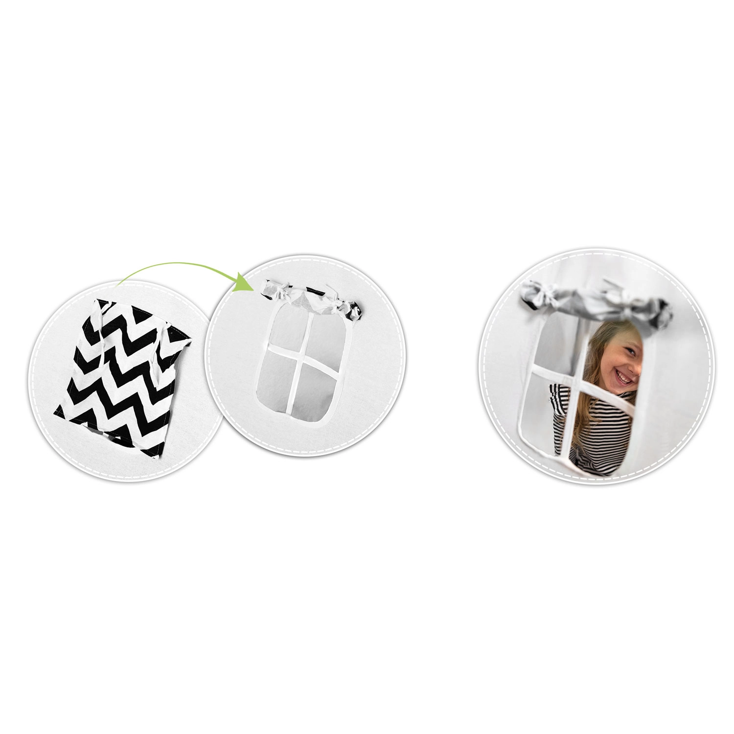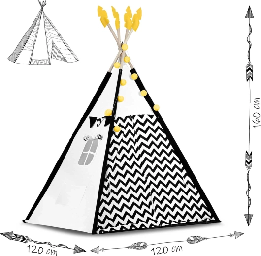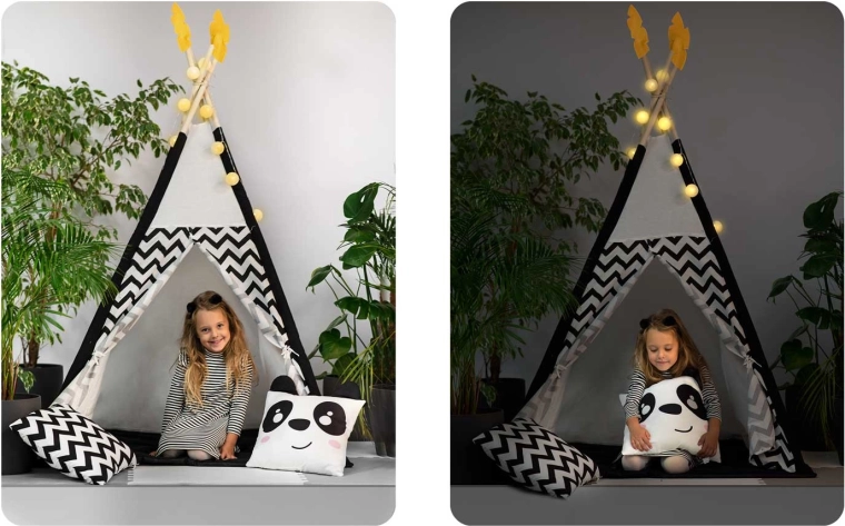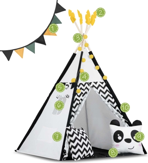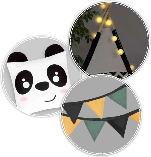 Minden egyben készlet: girland, dekoratív „tollak”, elemes LED fényfüzér (elemek nem tartozék), stabilizátor, 4 fenyőfa rúd, roló az ablakra, ablak, zseb, puha alátét, 2 párna és elcsúsztatható első falak a könnyű bejutáshoz. Gyors összeszerelés és szétszedés, hordozható, ideális gyerekszobába vagy árnyékos teraszra.