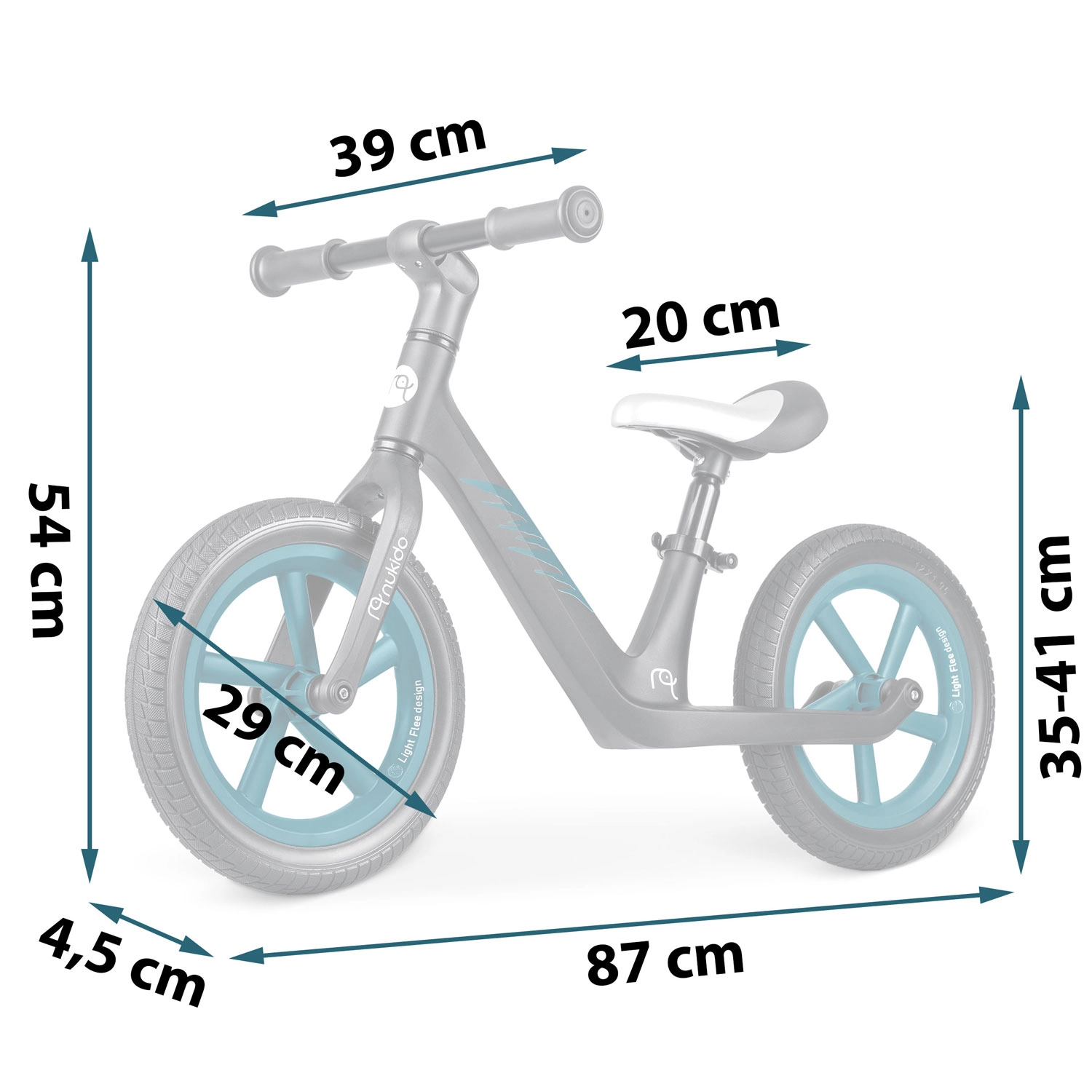 A NUKIDO Light Flee ideális első, pedál nélküli kerékpár a koordináció, az egyensúly és az önbizalom fejlesztéséhez. A könnyű felépítés és az alacsony átlépőmagasság megkönnyíti a kezelést, míg az EVA hab, belső nélküli gumik sima, karbantartásmentes gurulást biztosítanak bármilyen felületen.