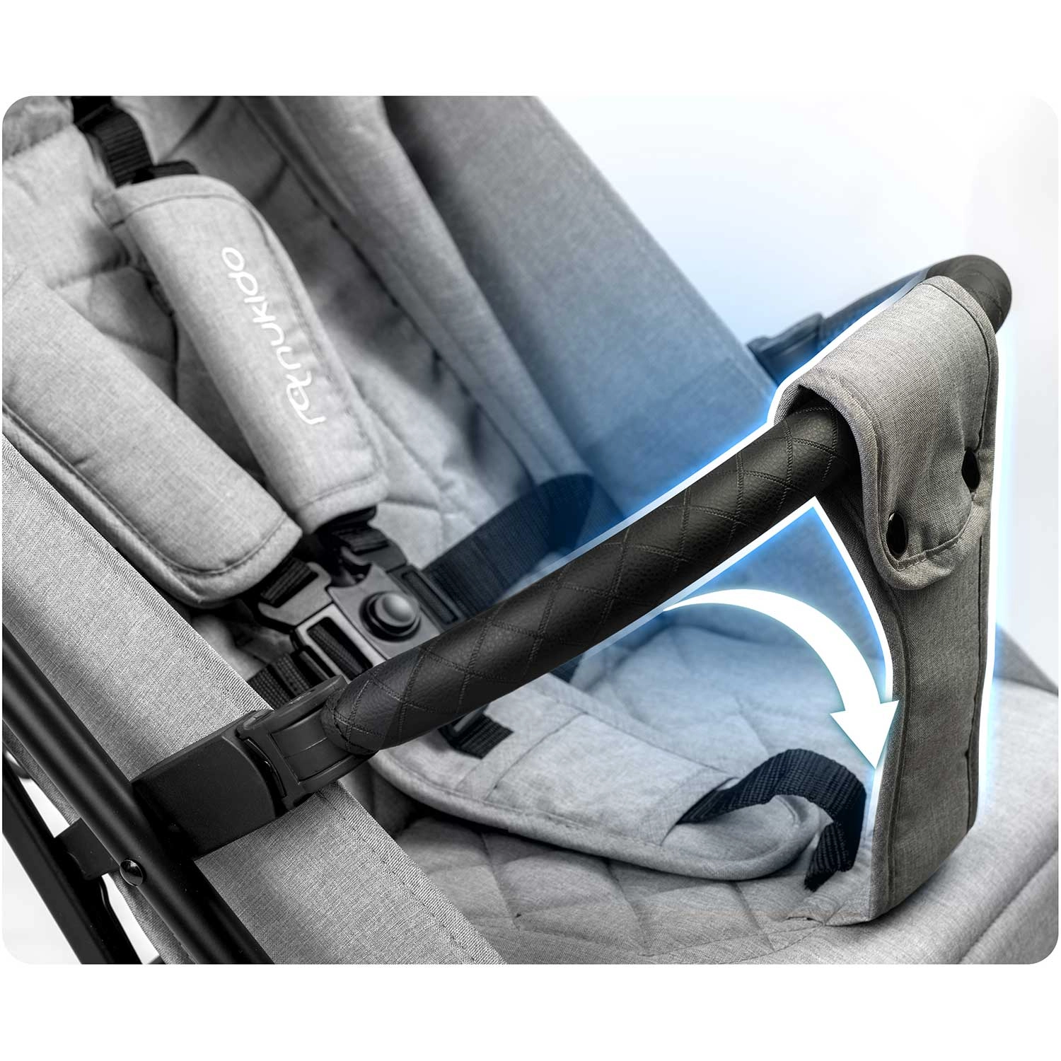 A praktikus felszereltséghez tartozik a tágas kosár az ülés alatt, a levehető karfa az egyszerű beültetéshez, esővédő és lábzsák a csomagban, valamint biztonságos, puha, kellemes tapintású textíliák. A nagy, bővíthető kupola véd a naptól, széltől és enyhe esőtől, és alkalmazkodik ahhoz, hogy a gyermek éppen alszik, vagy a környezetet figyeli.