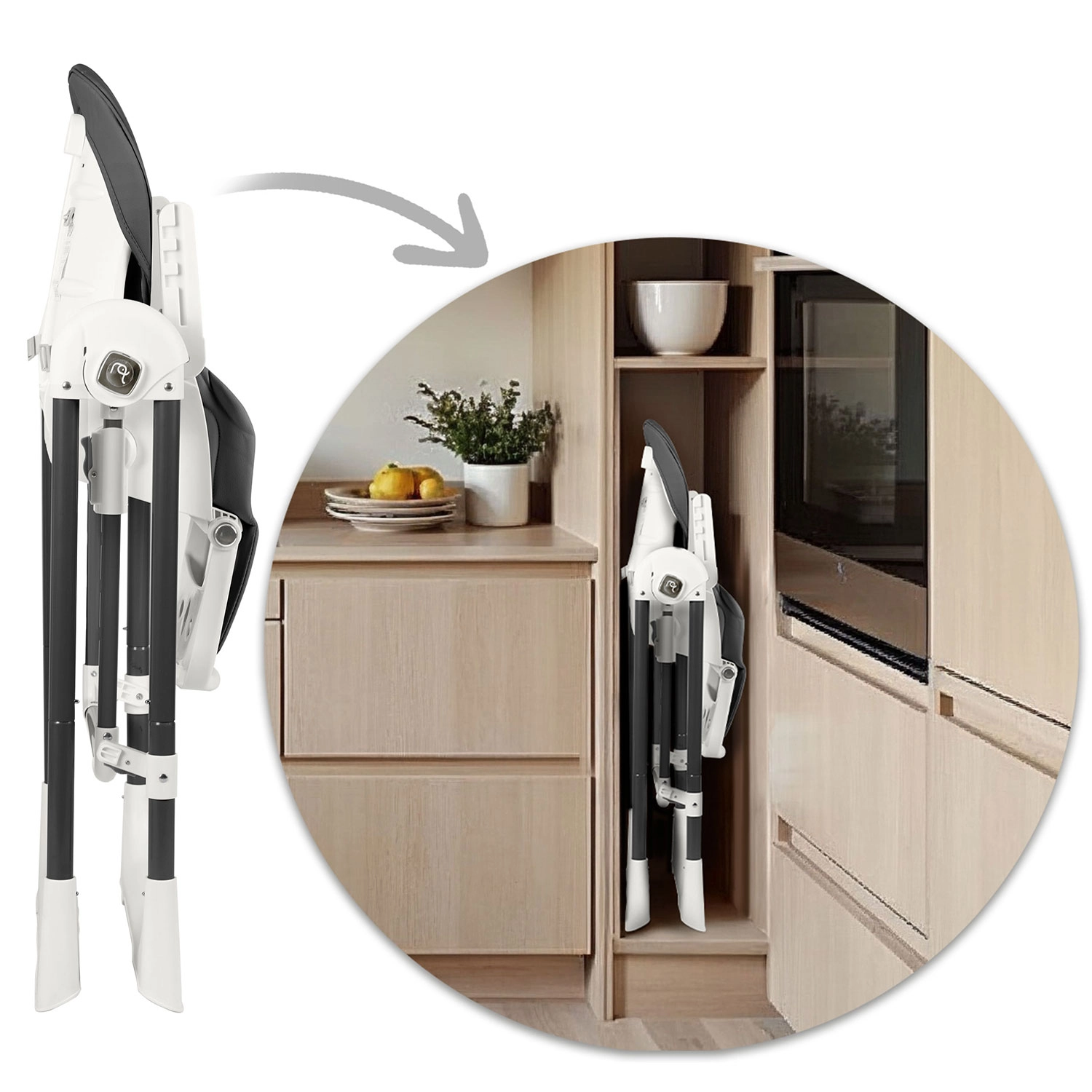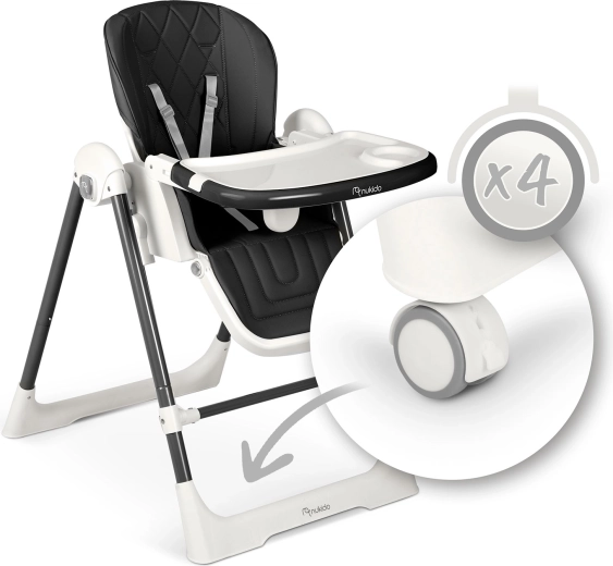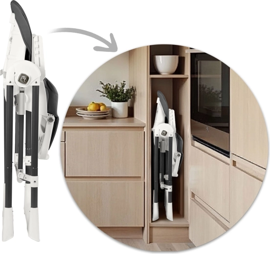 A levehető tálca kivehető felső betéttel gyorsan leemelhető és leöblíthető, a puha anyagú huzat egyszerűen áttörölhető. Az 5 pontos övek biztonságosan tartják a gyermeket, a széles lábak csúszásgátló végei stabilitást biztosítanak. Étkezés után a széket könnyedén összehajthatja helytakarékos méretre, és a kerekeknek köszönhetően erőfeszítés nélkül áthelyezheti oda, ahol épp szükség van rá.