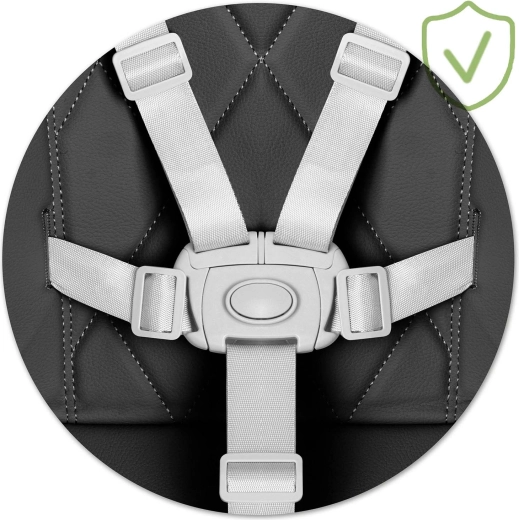 Erős, hosszban állítható 5 pontos övek tartós csattal, amelyek a gyermeket a megfelelő pozícióban tartják, és megakadályozzák az önálló kicsúszást az ülésből.