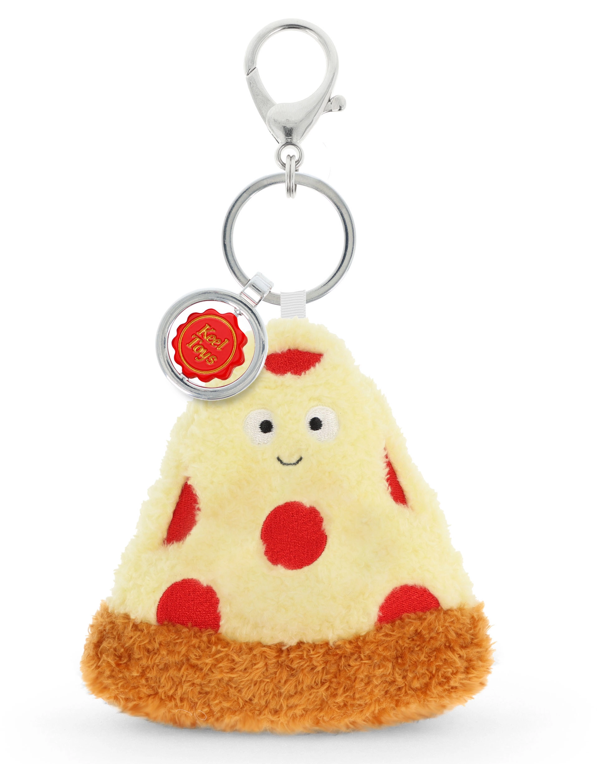A vidám plüss pizza táskadísz tökéletes kiegészítő gyerekeknek és felnőtteknek egyaránt. Színes dizájnja a „feltétekkel”, mint a sajt és egyéb hozzávalók, rögtön felkelti a figyelmet, és azonnal feldobja a hátizsákot, tolltartót vagy kulcsokat. A puha plüss kellemes tapintású és a mindennapi használatban is tartós.