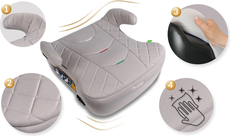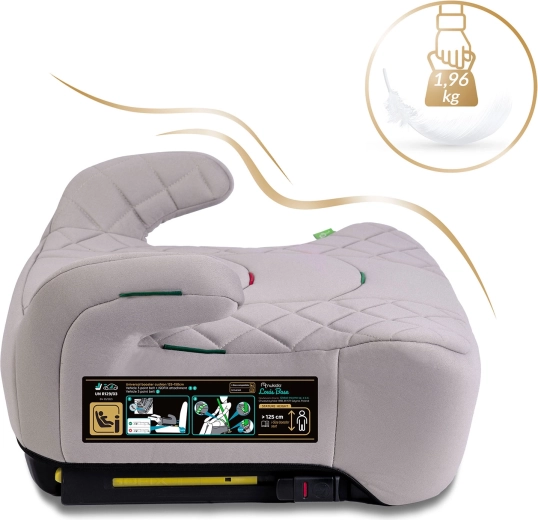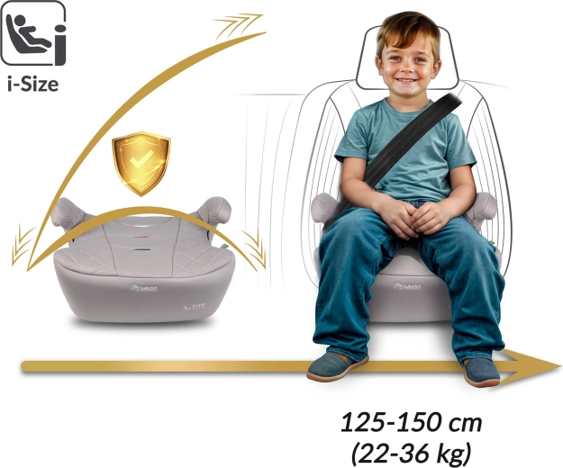 Biztonságos és kényelmes ülésmagasító idősebb, 125–150 cm magas és 22–36 kg súlyú gyermekek számára, ISOFIX rögzítéssel. Megfelel a szigorú ECE R129 / i-Size szabványnak, gyors és biztos beszerelést kínál, ergonomikusan formázott üléssel, puha párnázással és könnyen levehető huzattal, 30 °C-on mosható.
