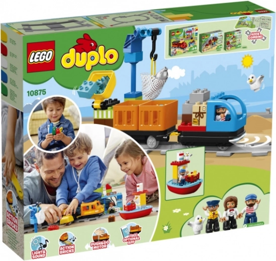 Interaktív LEGO DUPLO tehervonat egyszerű vezérlést és rengeteg játéklehetőséget kínál a gyerekeknek. A kézi indításnak köszönhetően elég a vonatot finoman előre vagy hátra lökni, és már indul is, megállítani pedig enyhe nyomással vagy felemeléssel lehet. Öt színes akciókocka indítja a hangokat, a fényeket, a tankolást, az irányváltást és a megállást. A készlet része a kikötő, csónak, kávézó, rakodóállomás, két daru, sok vágány és DUPLO figurák. Opcionális alkalmazás biztosít távirányítást és további tevékenységeket.