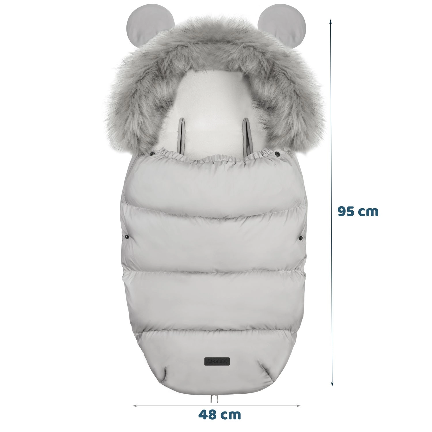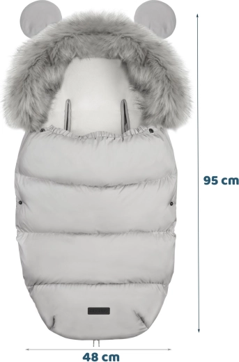 A praktikus, kétirányú cipzárak lehetővé teszik a gyors szellőztetést alulról és a könnyű nyitást felülről, így a bundazsák könnyen az aktuális időjáráshoz igazítható. A levehető műszőrmét mosás előtt le lehet pattintani. A bundazsák teljesen szétnyitható és babakocsi-betétként is használható.