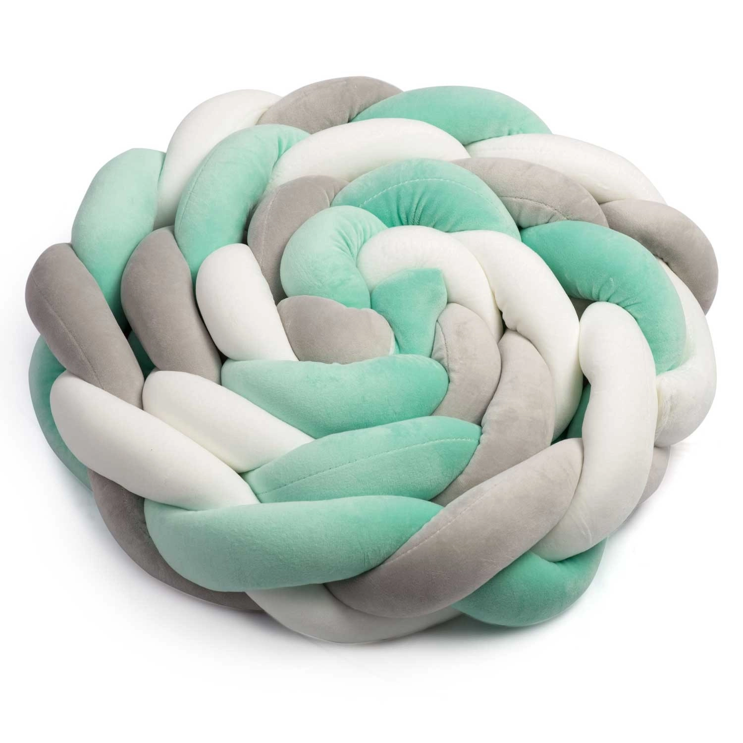 A Ricokids fonott kiságyvédő 2 m hosszú és kb. 11,5 cm magas, puha, védő gátat képez a baba körül. A selymes anyag kellemes tapintású, antiallergén és éles részek nélküli, ezért már újszülött kortól alkalmas. A menta, szürke és fehér skandináv hangulatú kombinációja finom eleganciát ad a térnek.