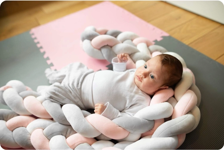 Könnyen igazítható kiságyhoz, bölcsőhöz vagy játszósarokhoz. Alakítható köralakba vagy a rácsok mentén a maximális védelem és kényelem érdekében.