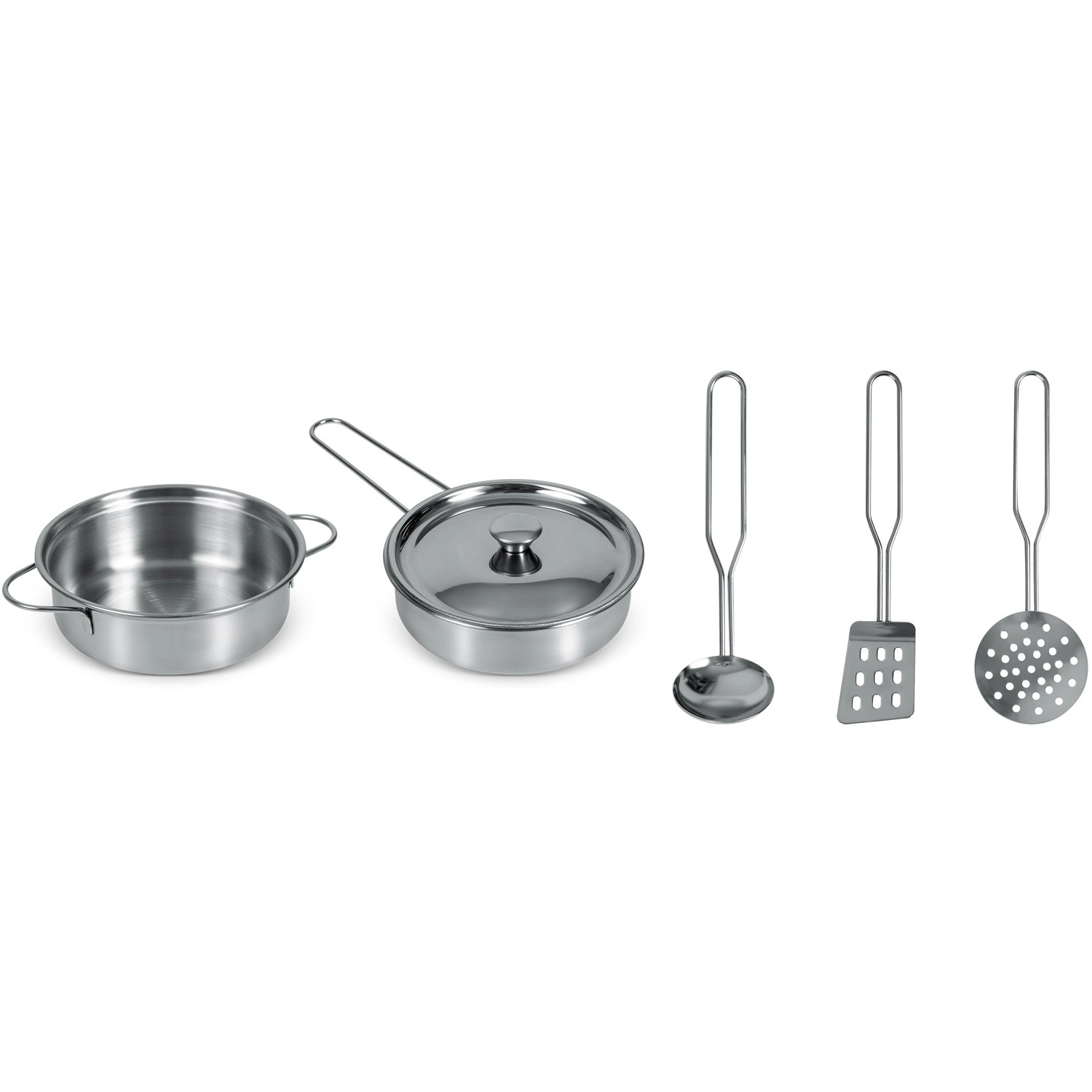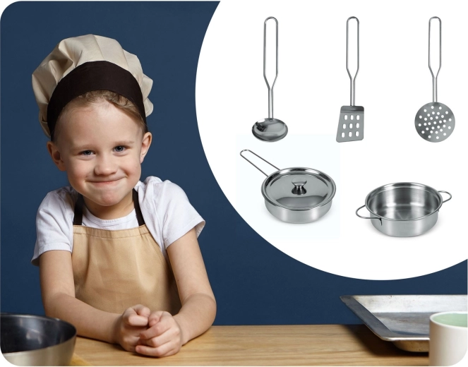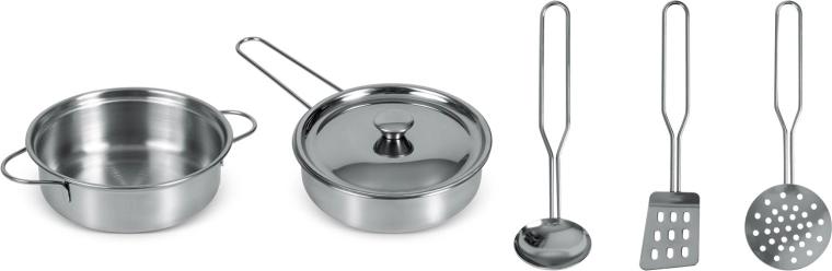 Fazék, lábas fedővel és három hasznos eszköz gyerek méretben – mind tartós, fényes felületű rozsdamentes acélból az élethű főzős játékért.